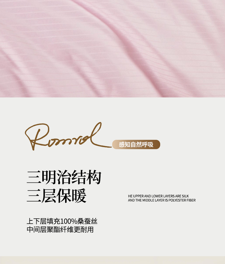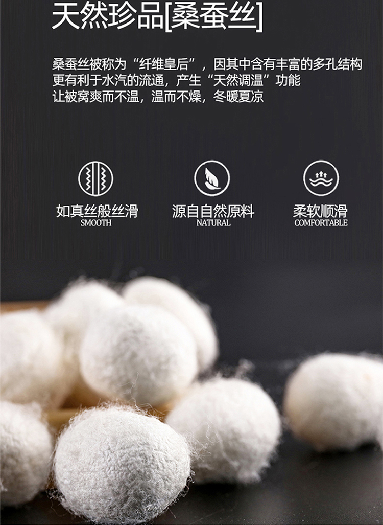 以100%双宫茧桑蚕丝为内外层,搭配高弹聚酯纤维中层,打造1600g黄金克重填充。外层桑蚕丝如丝绸般柔滑亲肤,中层纤维锁温蓄热,内层蚕丝透气排湿,三层协同维持舒适睡眠温度。1600g填充量带来恰到好处的包裹感,既保暖又不显厚重,让您如卧云端。聚酯纤维的加入增强了被子的耐用性和抗皱性,让蚕丝被更易打理。手工绗缝工艺确保丝胎均匀稳固,长久使用仍保持蓬松如初。蚕梦云栖被,让每一夜都沉浸在奢华的睡眠体验中,宛如蚕丝编织的云朵,温柔托起您的每一个美梦。