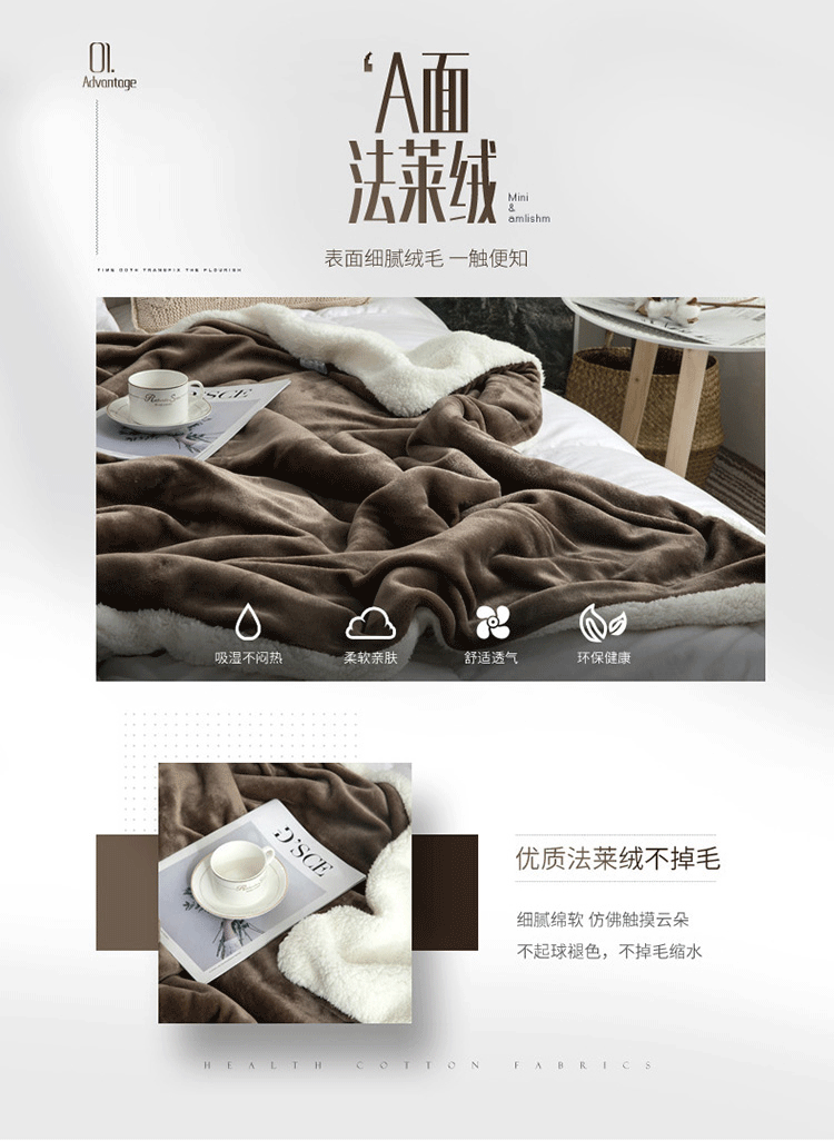 A版法莱绒,B版羊羔绒毛毯,独特的AB版设计,层次更加丰富,让生活与众不同,原生态健康睡眠体验。不易褪色,不易掉毛,不易起球,无静电。手感柔软舒适、质感丰厚,悬垂感强,柔软保暖,环保健康,细致绗缝,精密有序,细节彰显品质。