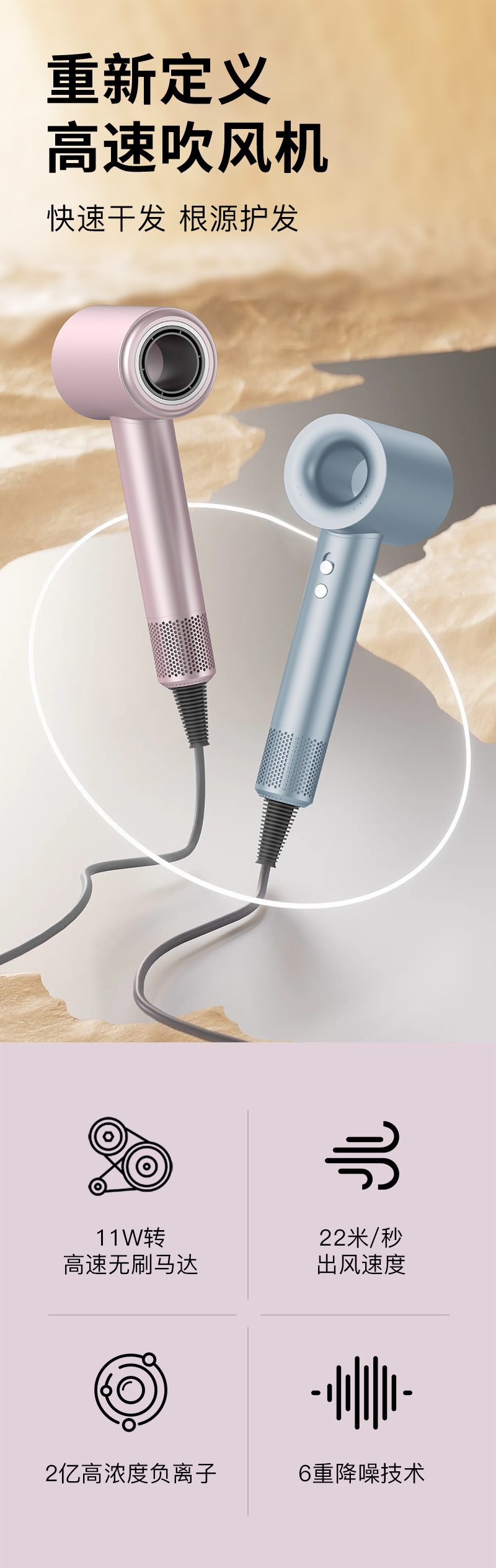 11W 转高速无刷马达;22M/秒出风速度,2万亿高浓度负离子6重降噪技术。