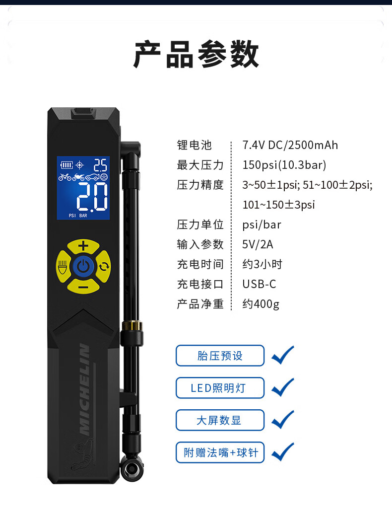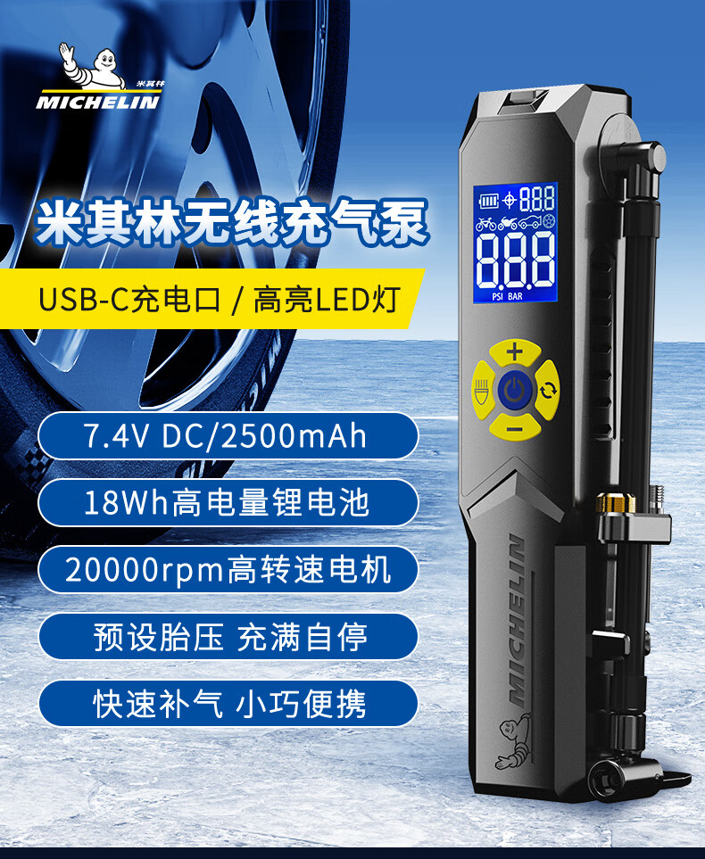 米其林数显便携升级款无线锂电充气泵 可预设胎压