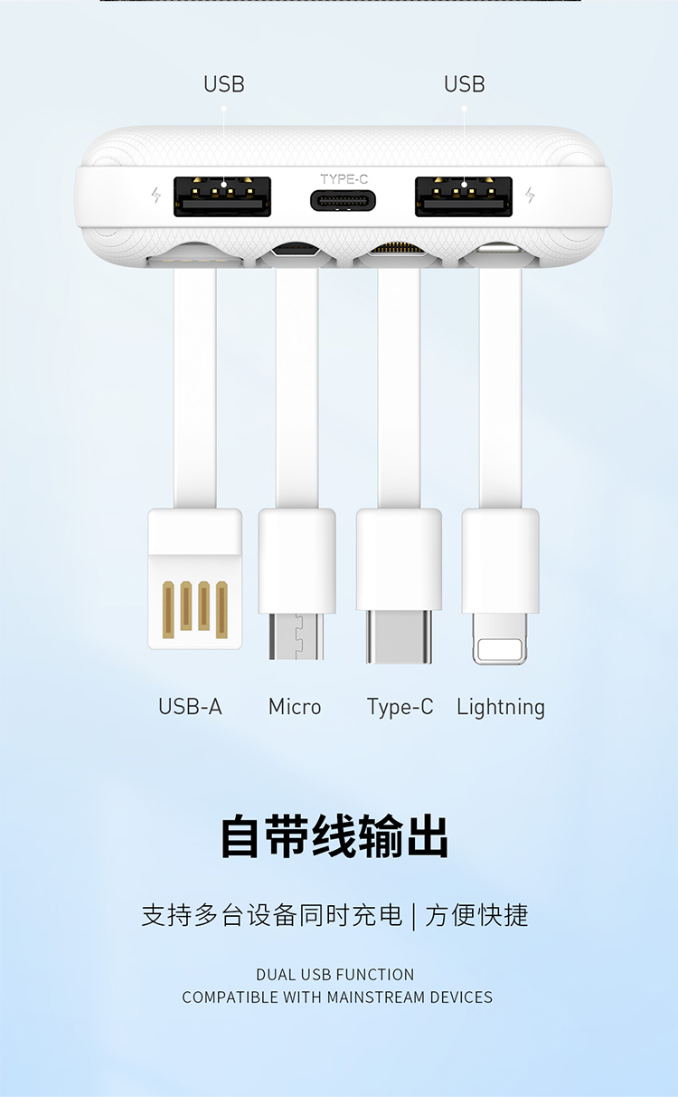 RECCI锐思 RP01移动电源自带线Lightning+Type- USB口充电宝 10000毫安
