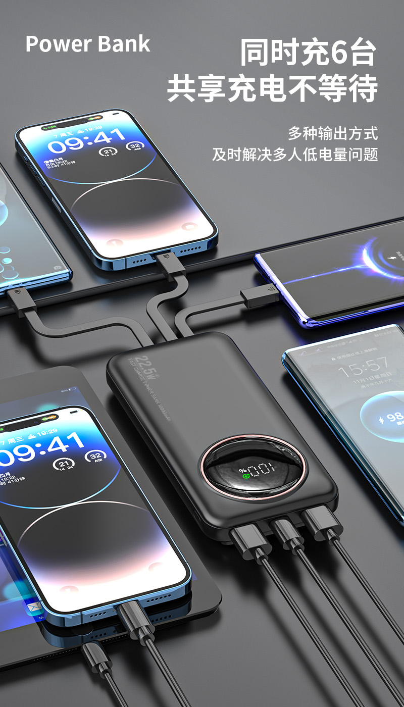 1,同时支持6台手机充电(自带4条线,六输出双输入);