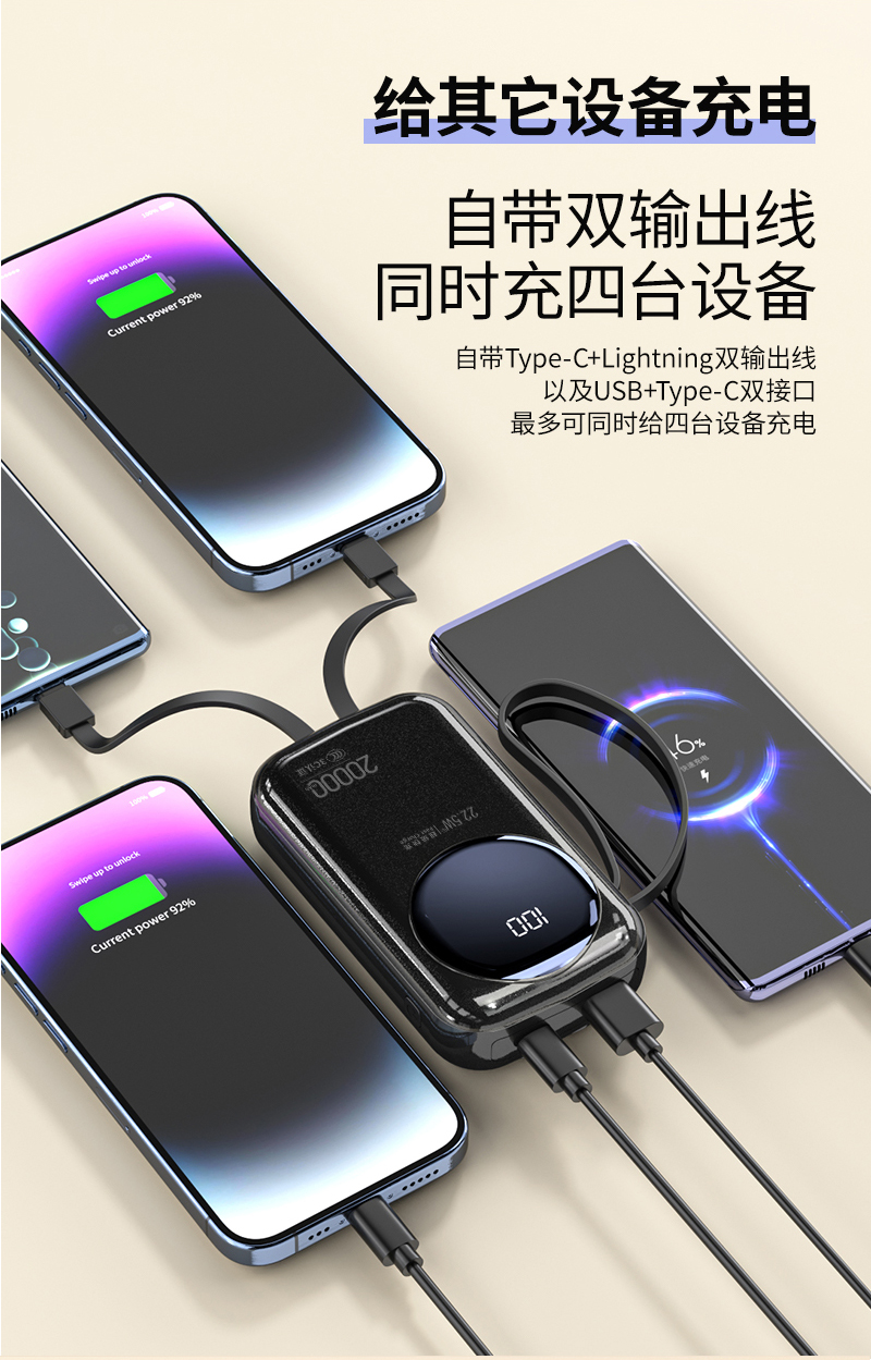 3. 自带Type-C+Lightning双输出线以及USB+Type-C双接口可同时给四台设备充电;