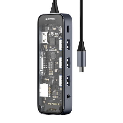 RECCI锐思RH22十合一HUB数据线转接口Type-C TO HDMI+1xVGA+ USB-A+USB-C+RJ45+1xSD+ 1xTF