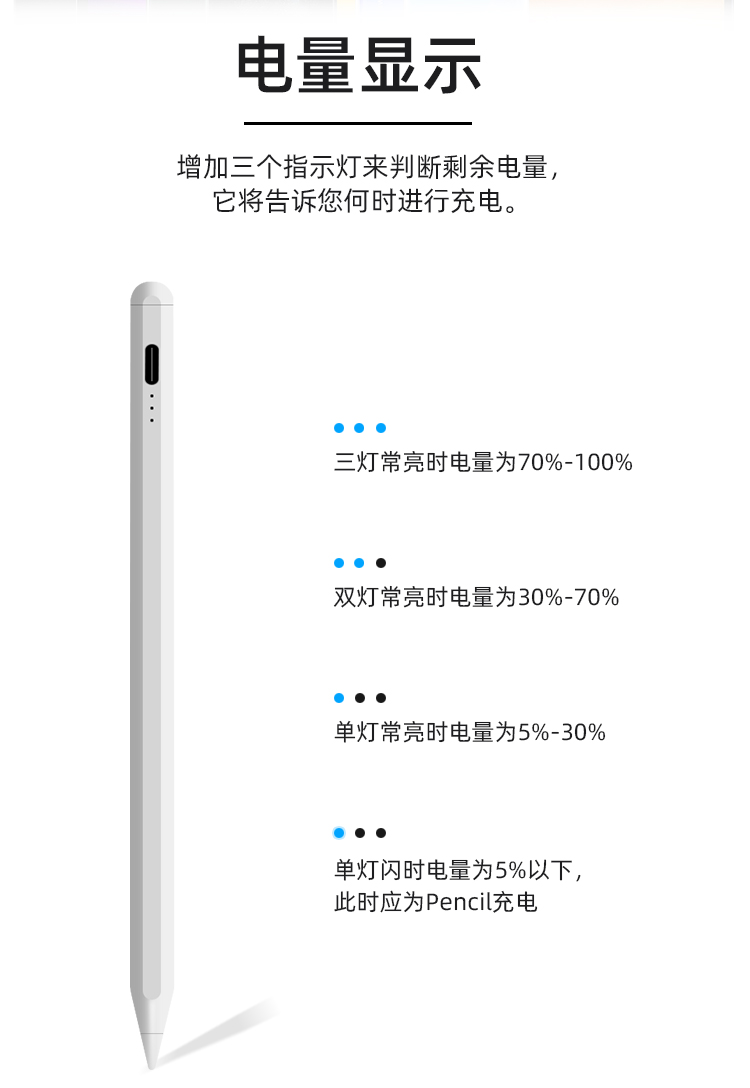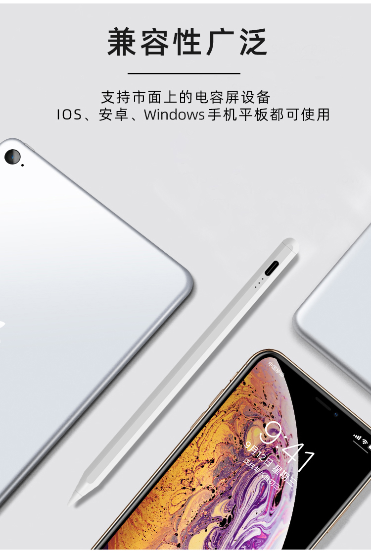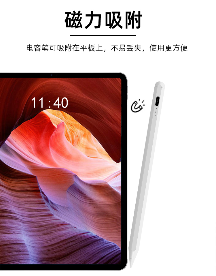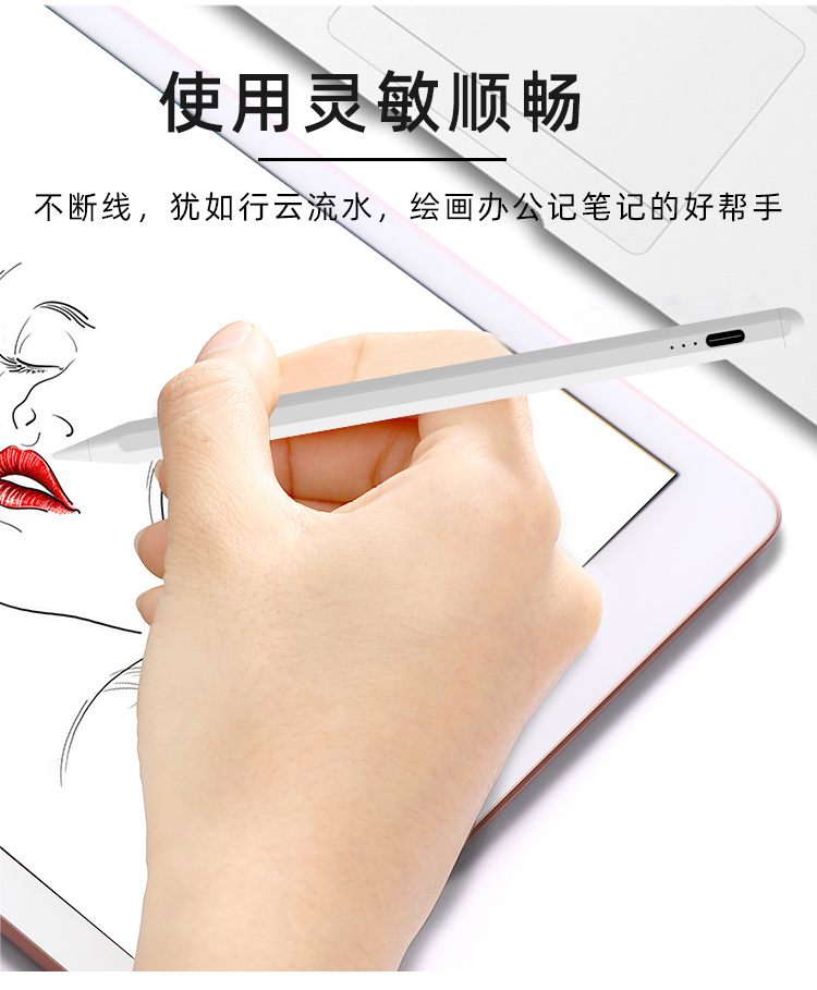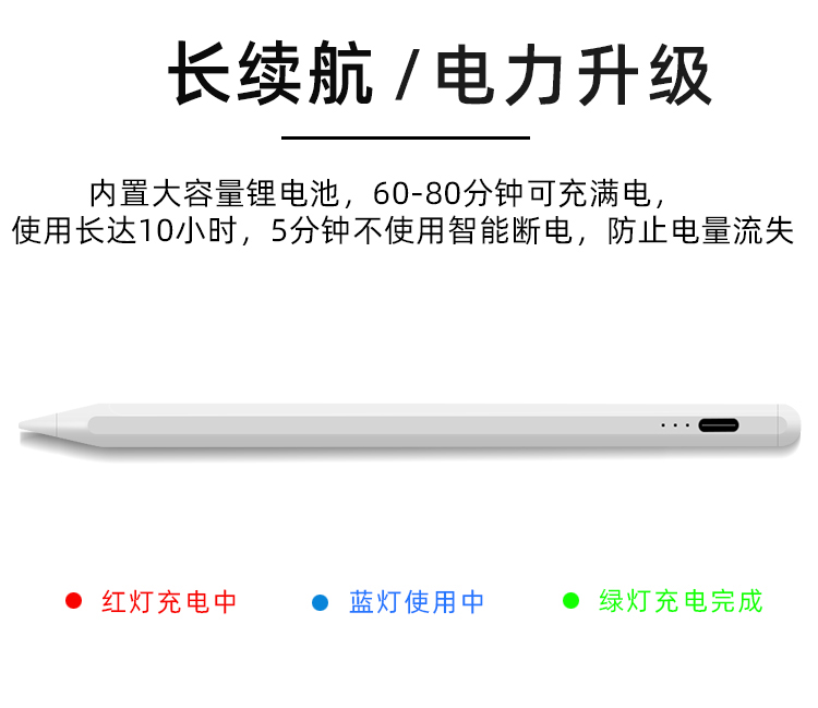 3.笔头可拆卸更换,可吸附ipad.长续航/电力升级,内置大容量锂电池,60-80分钟可充满电,使用长达10小时,5分钟不使用智能断电,防止电量流失.