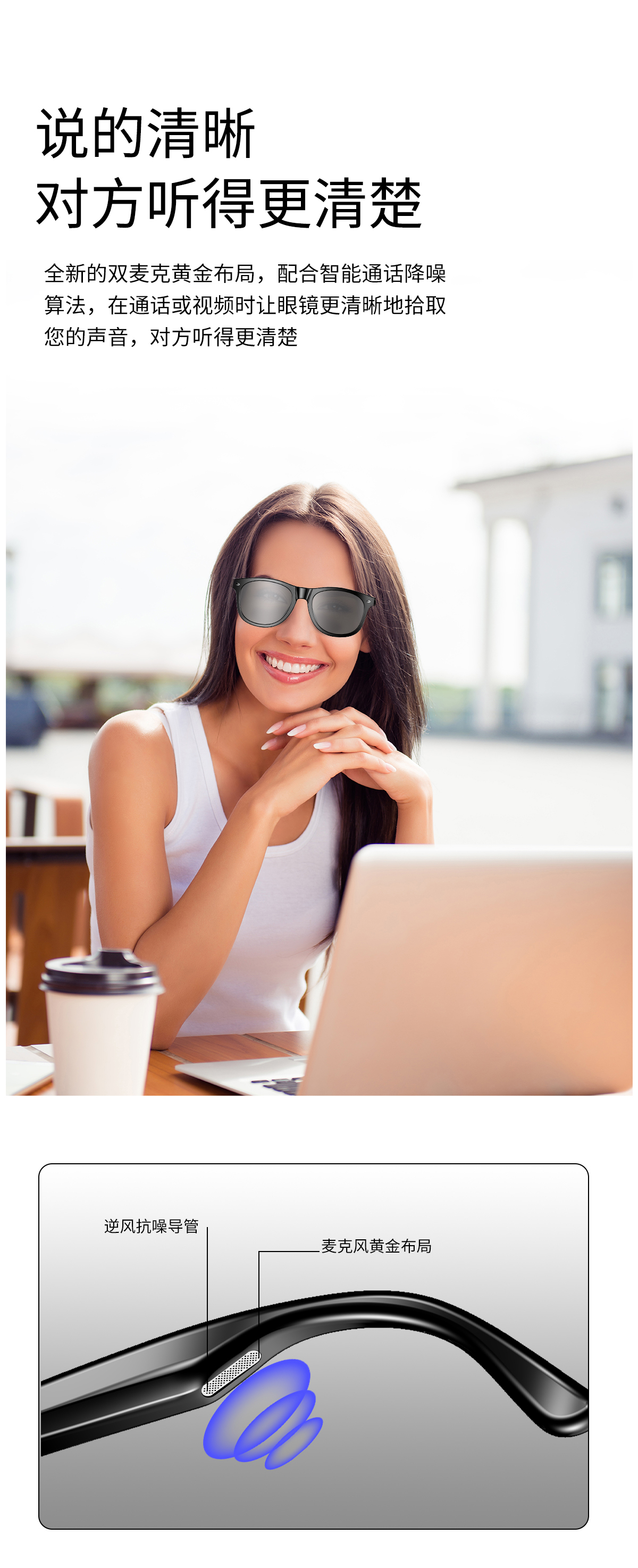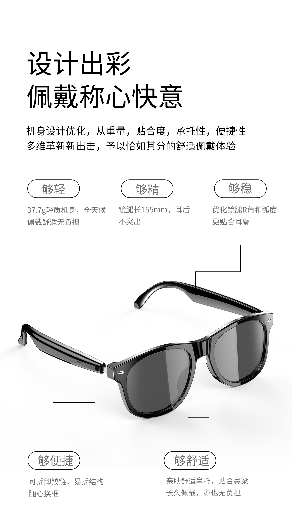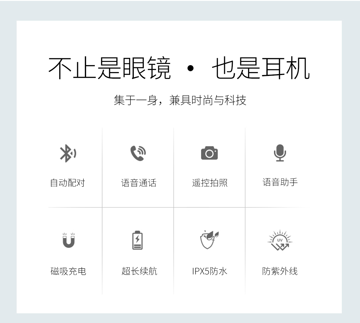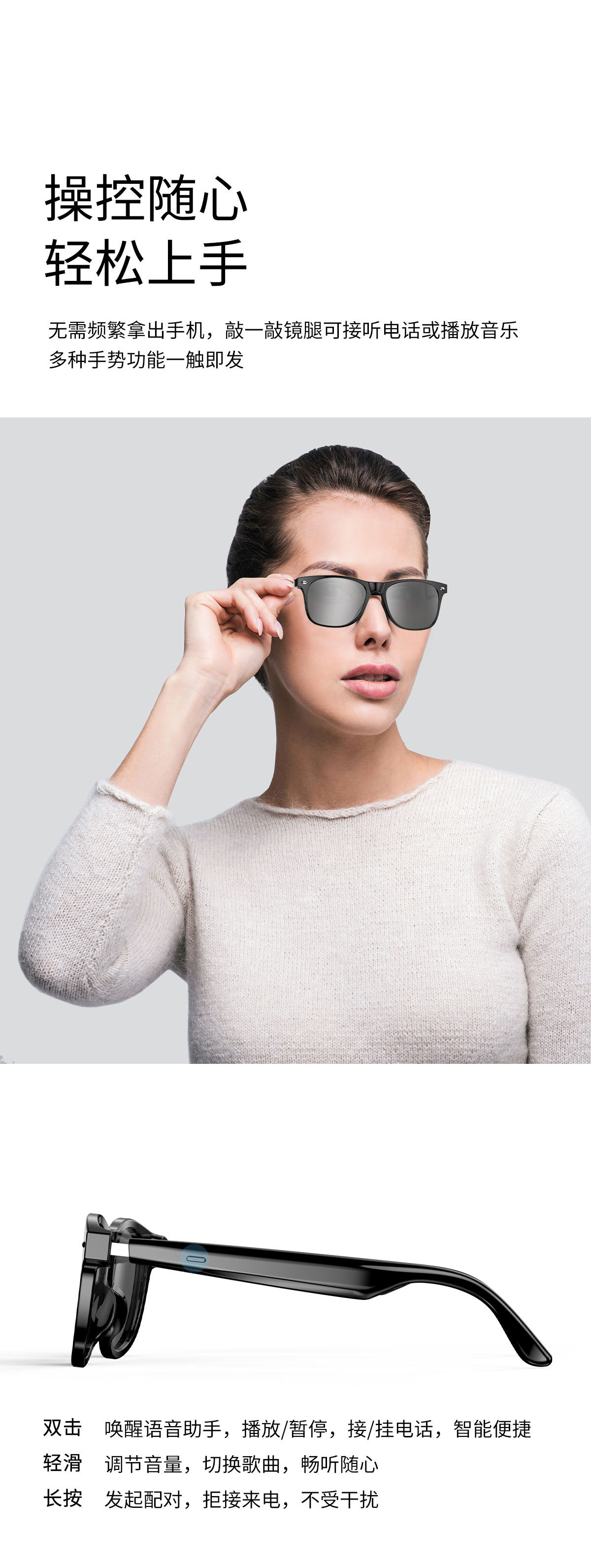 2,既是蓝牙耳机,又是高清户外太阳墨镜,便携多功能合一,听歌,打电话,语音助手;