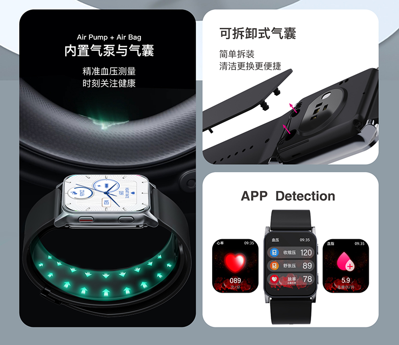 3,可拆卸气囊,简单拆装,清洁便捷,也可以拆卸当普通智能手表使用。