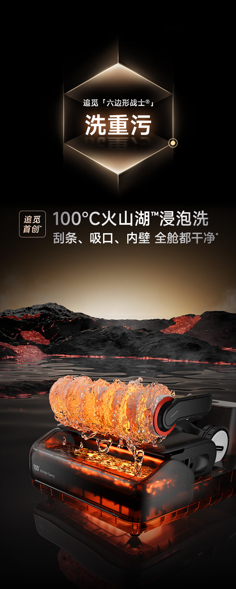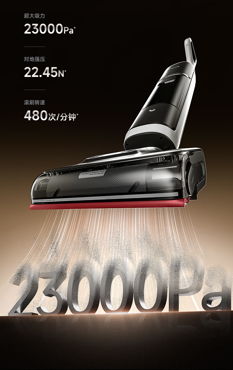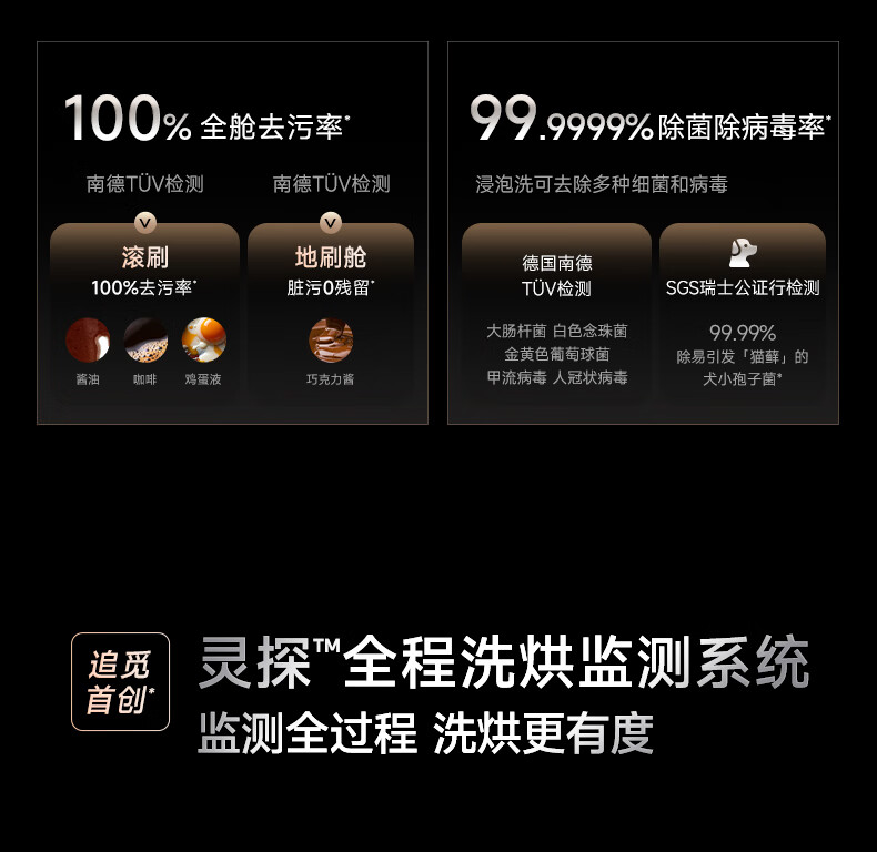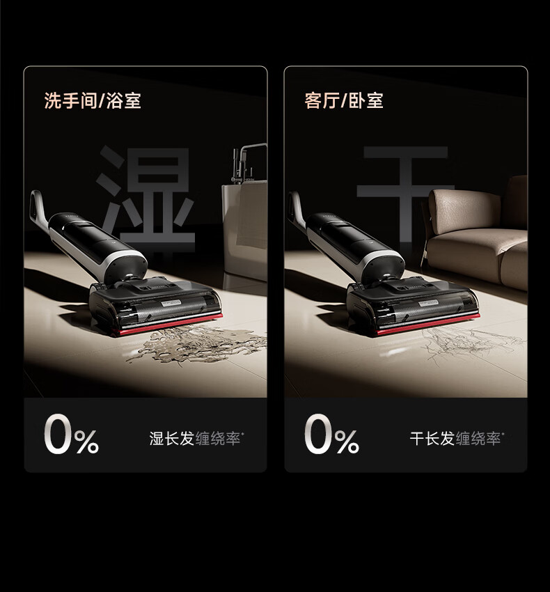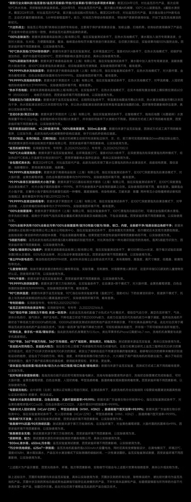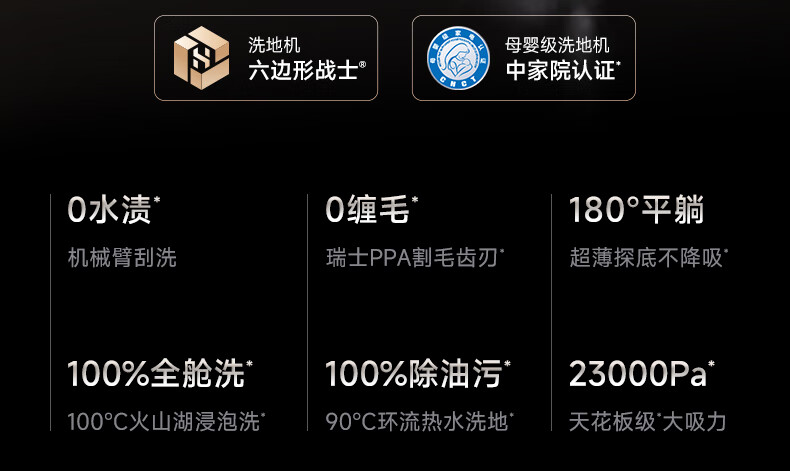 0缠毛、0水渍、平躺、100%全舱洗、100%除油污、21000Pa天花板吸力