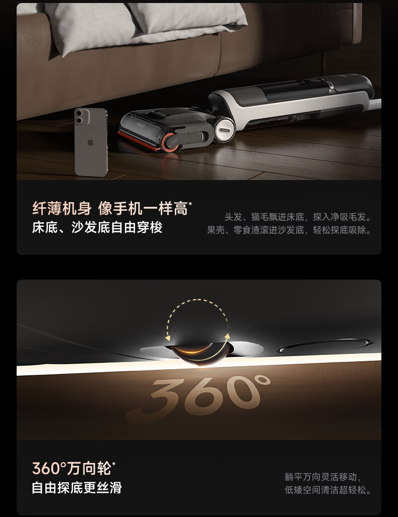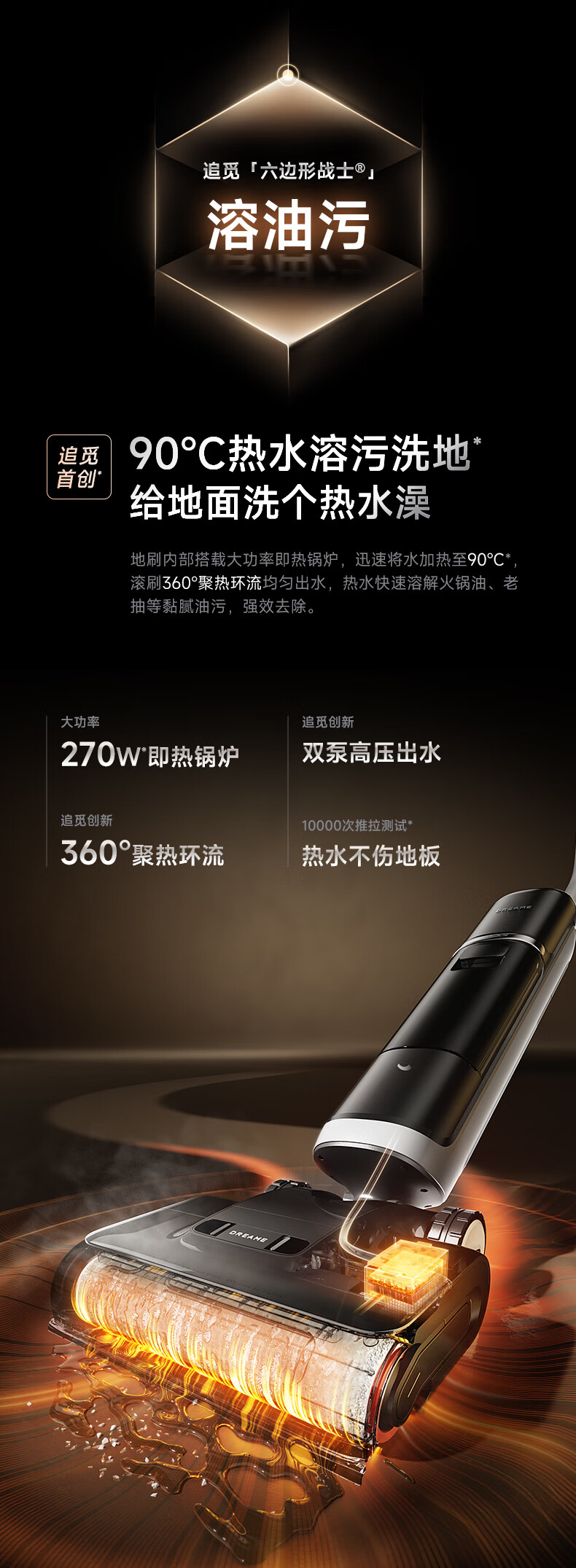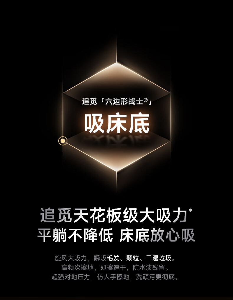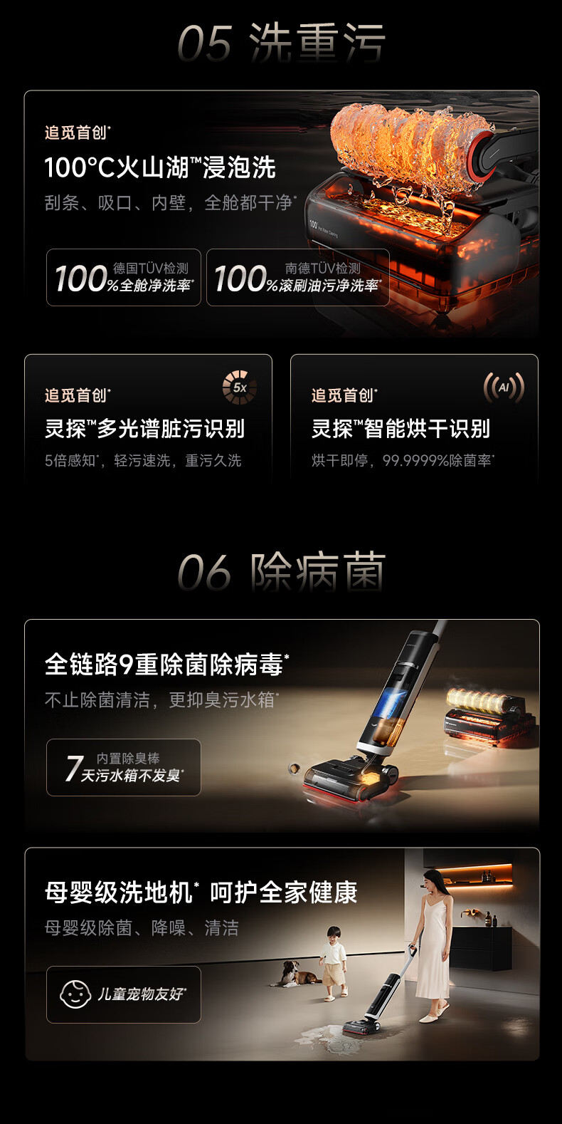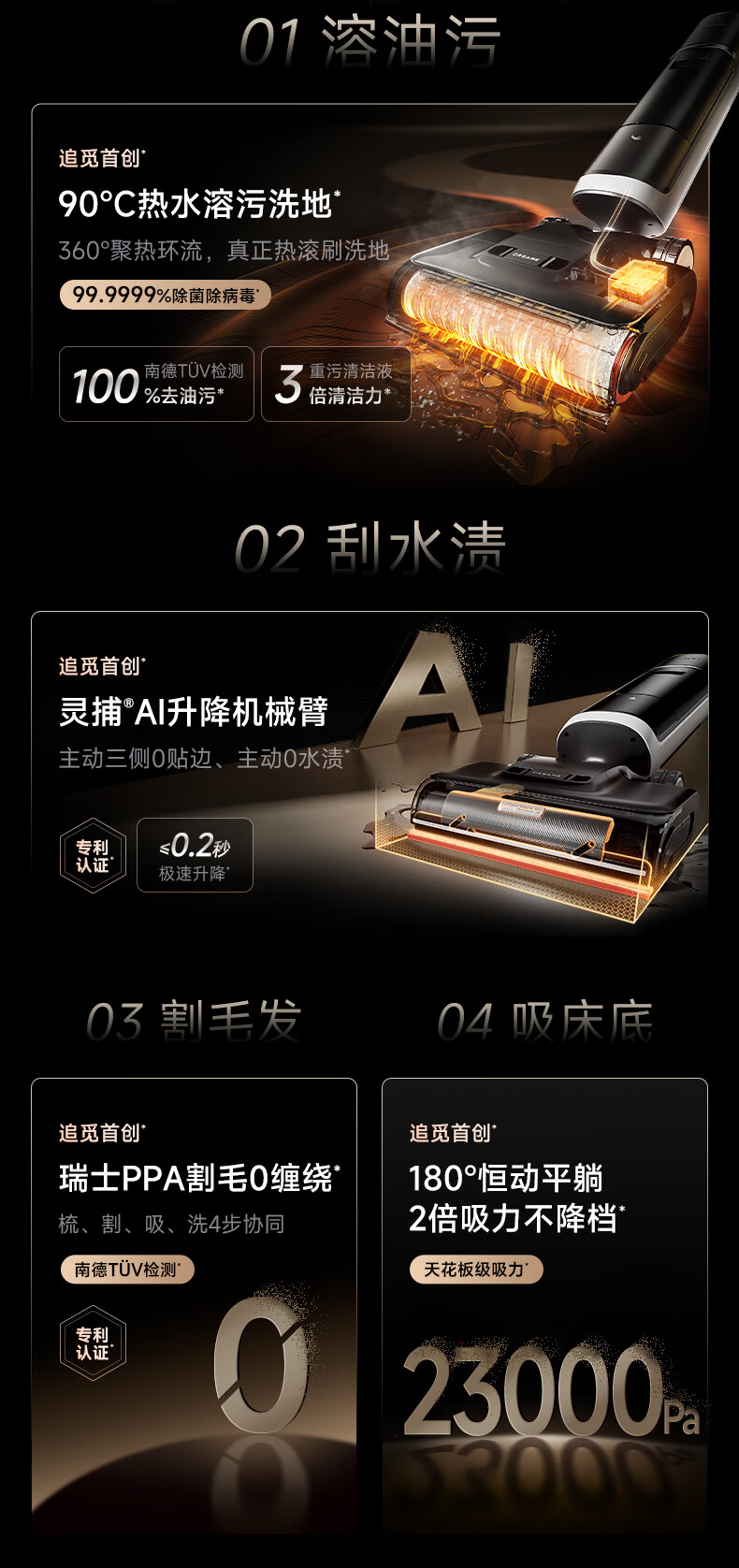 0缠毛、0水渍、平躺、100%全舱洗、100%除油污、21000Pa天花板吸力