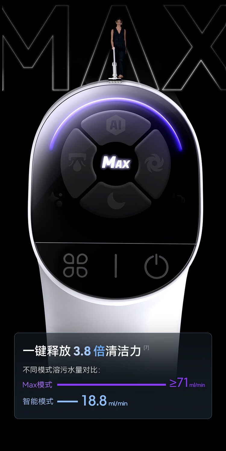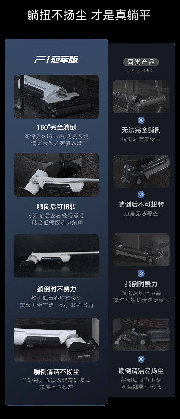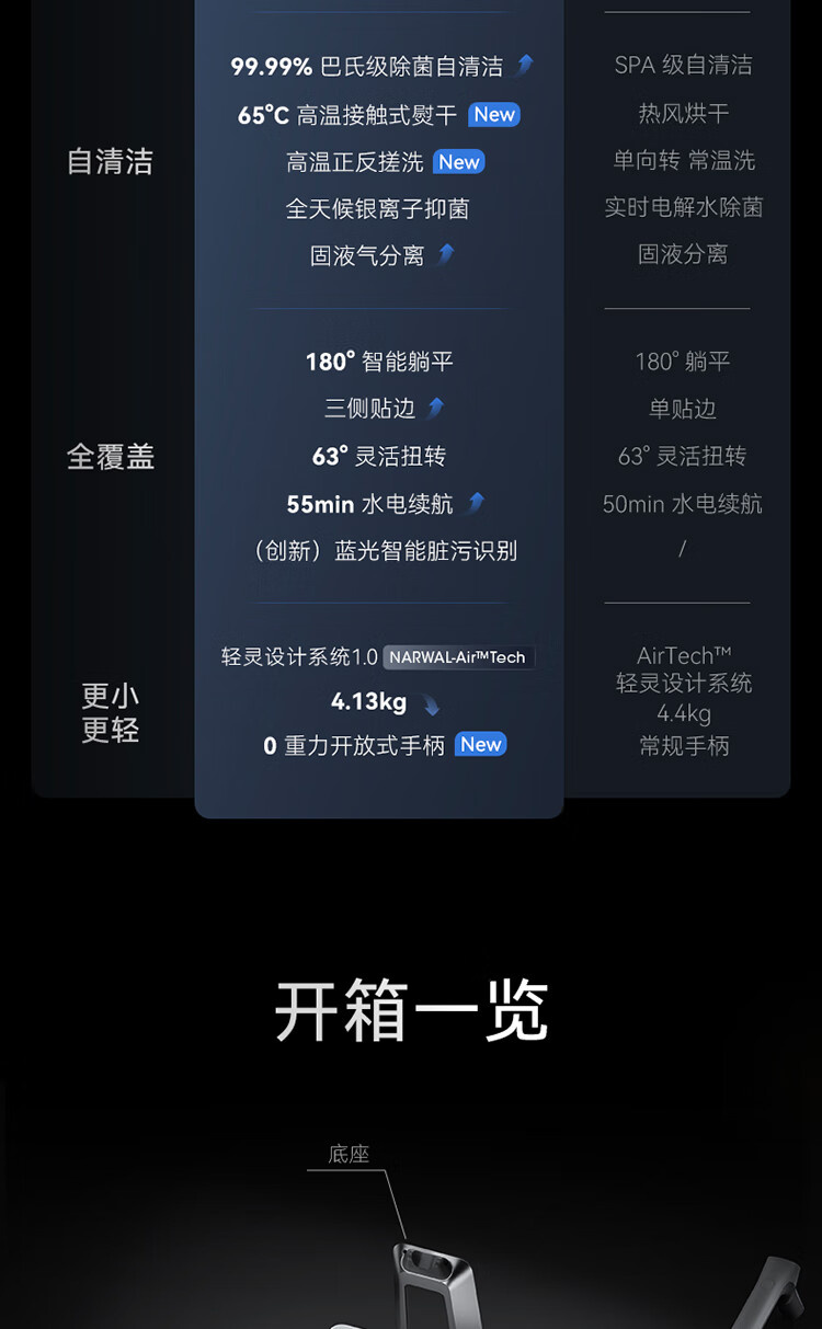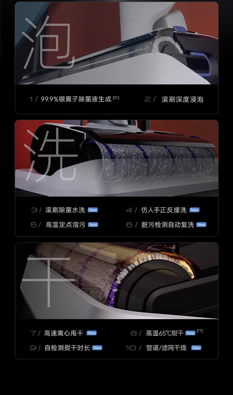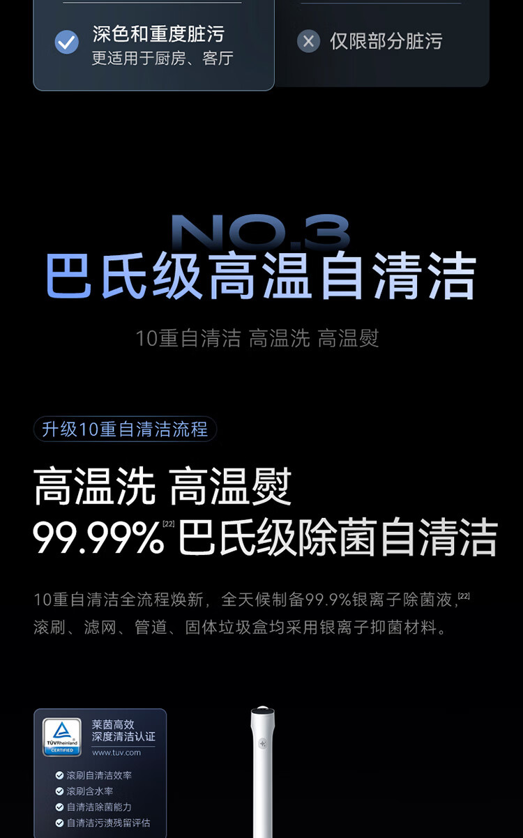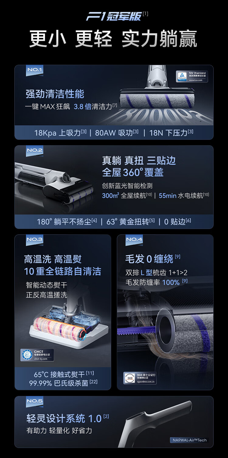 18000Pa大吸力、180°躺平、防缠绕、三贴边、银离子除菌、续航55min、前后左右全方位助力、高温熨干
