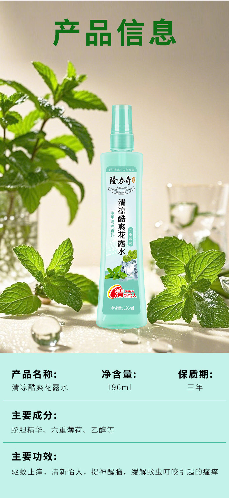 2.清凉舒爽:天然薄荷与蛇胆成分,祛痱止痒,提神醒肤;