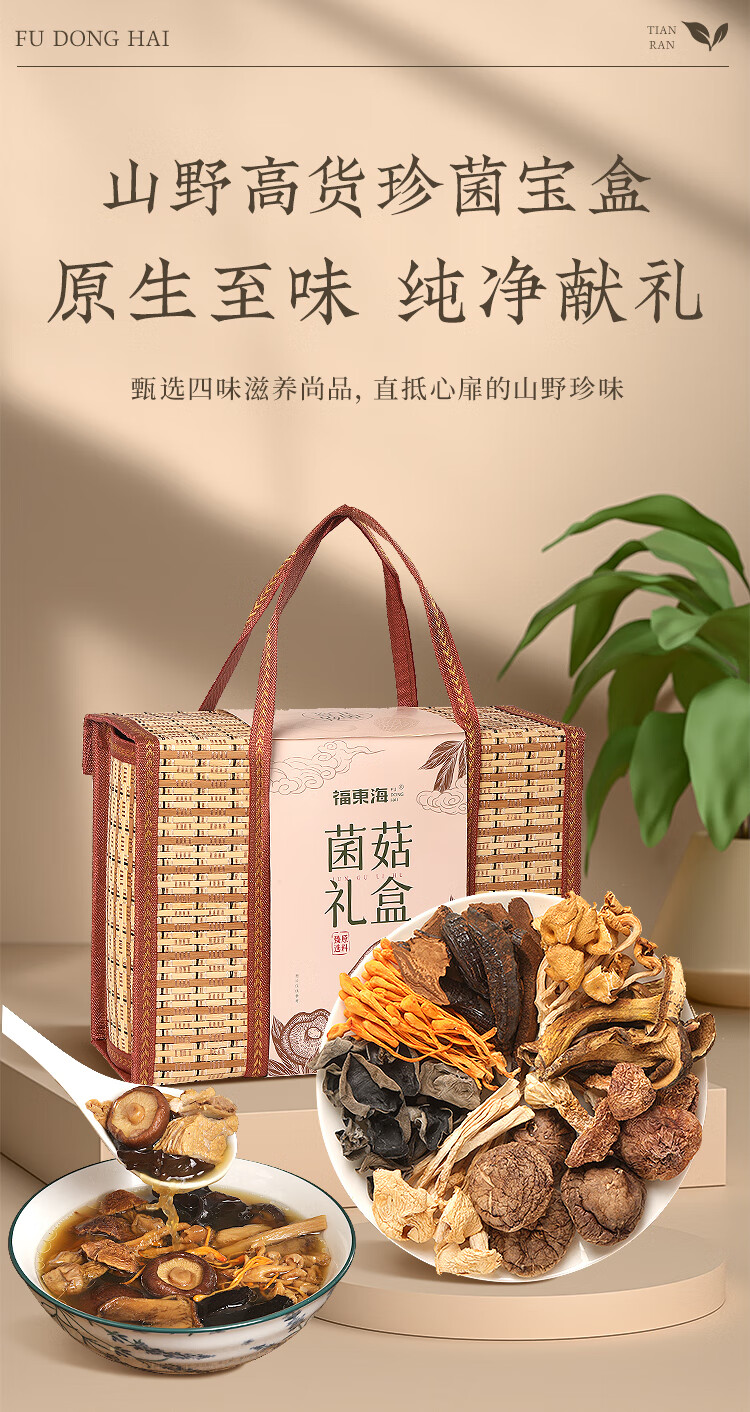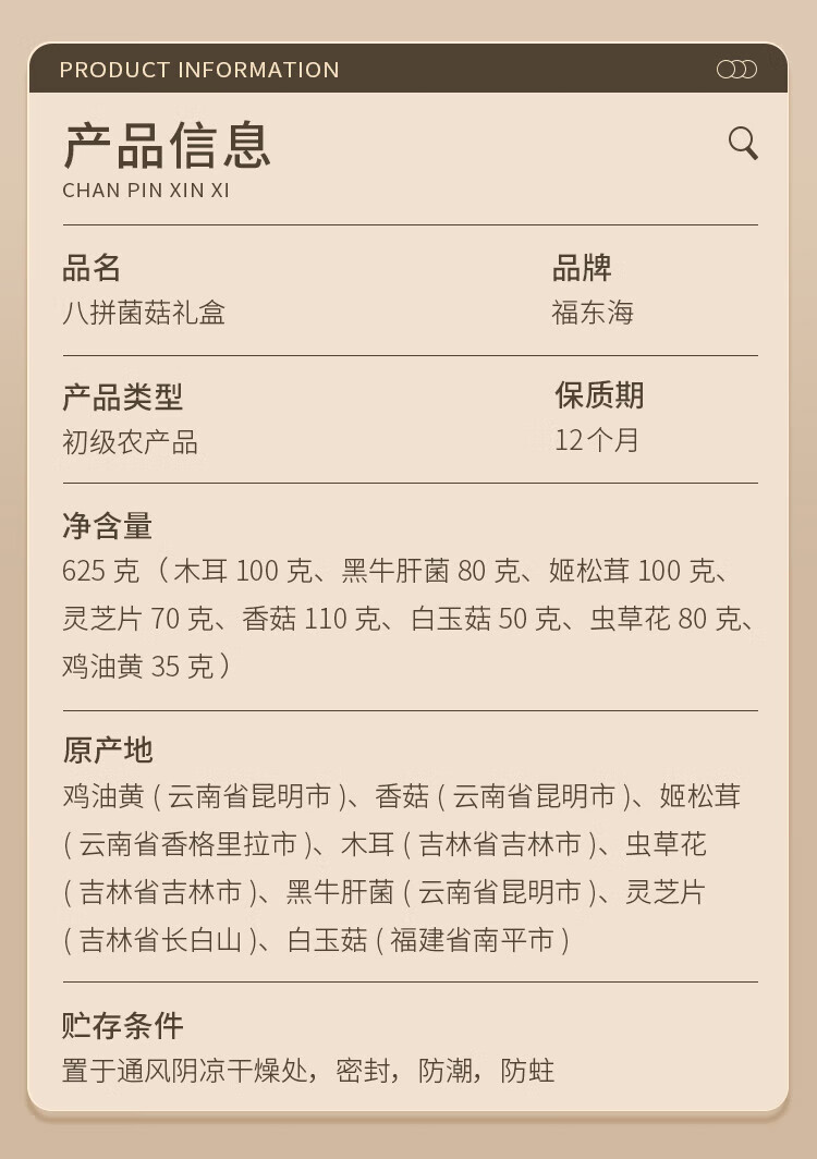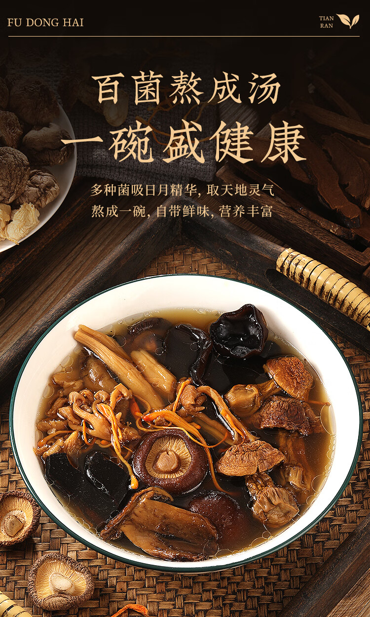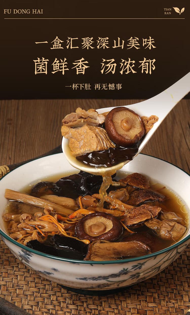(鸡油黄35克+香菇110克+姬松茸100克+木耳100克+虫草花80克+黑牛肝菌80克+灵芝片70克+白玉菇50克)
