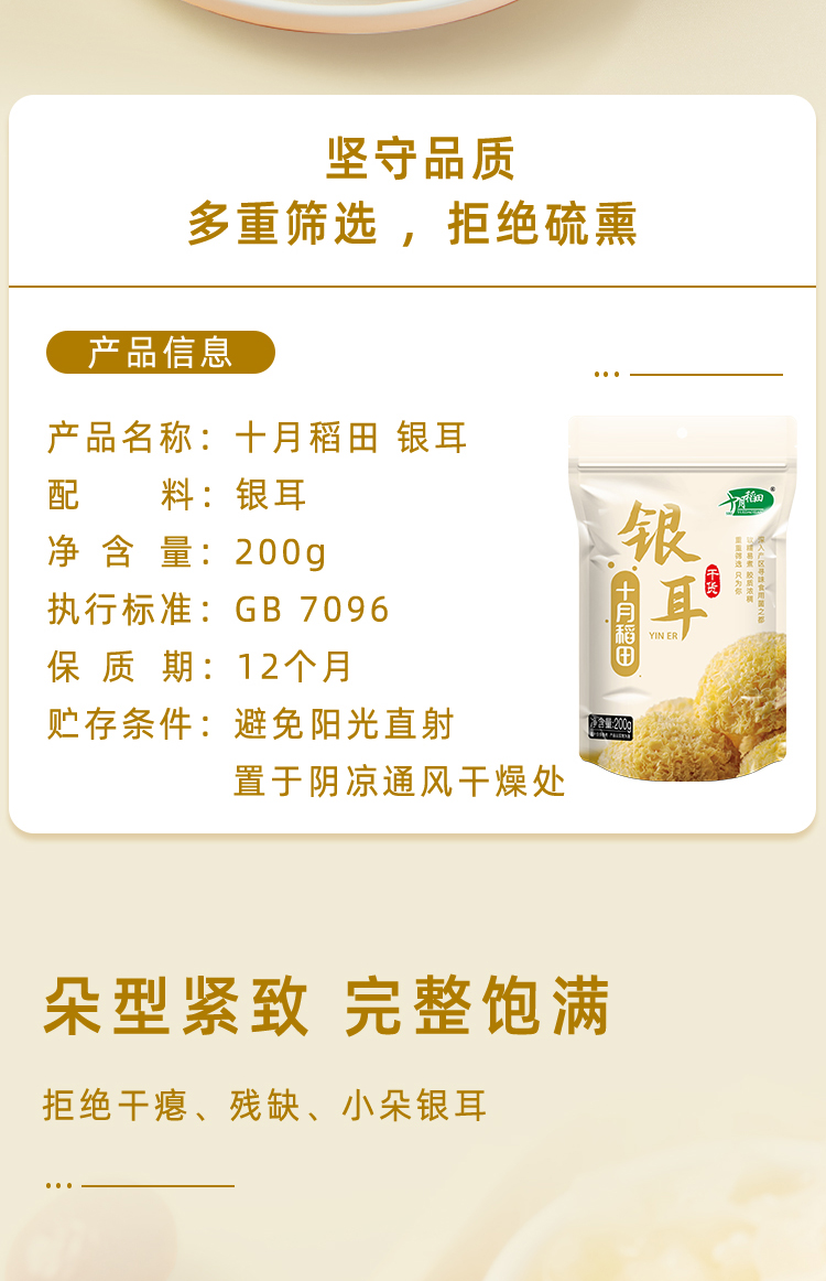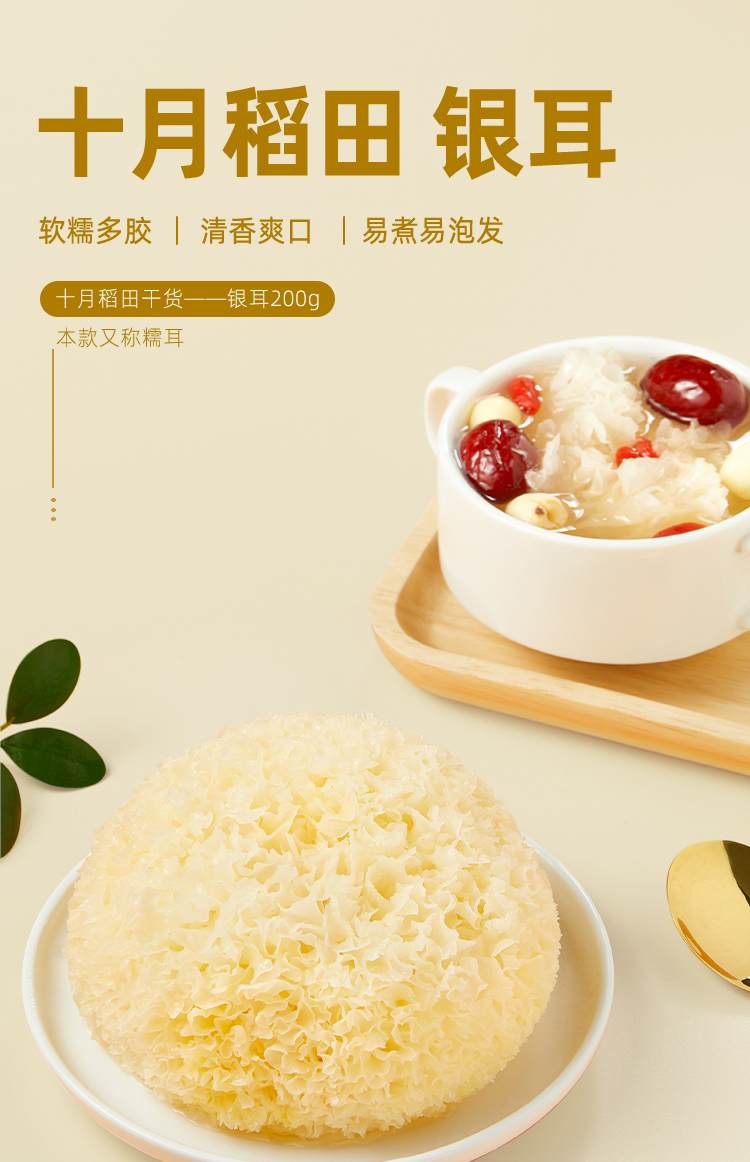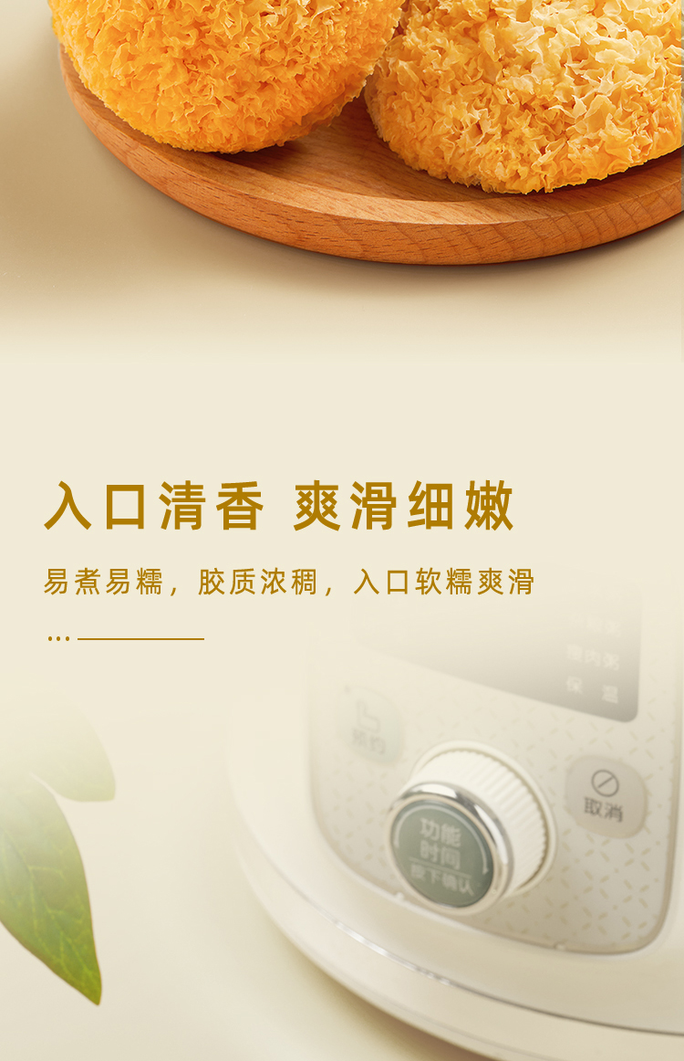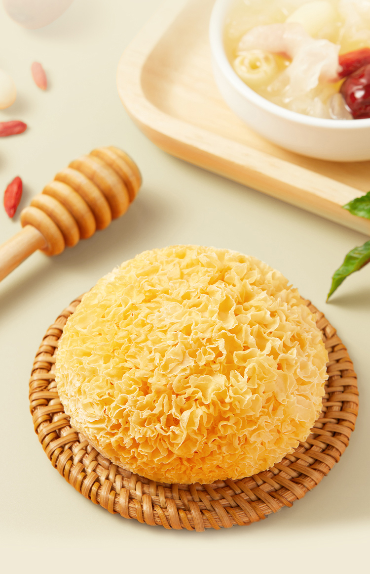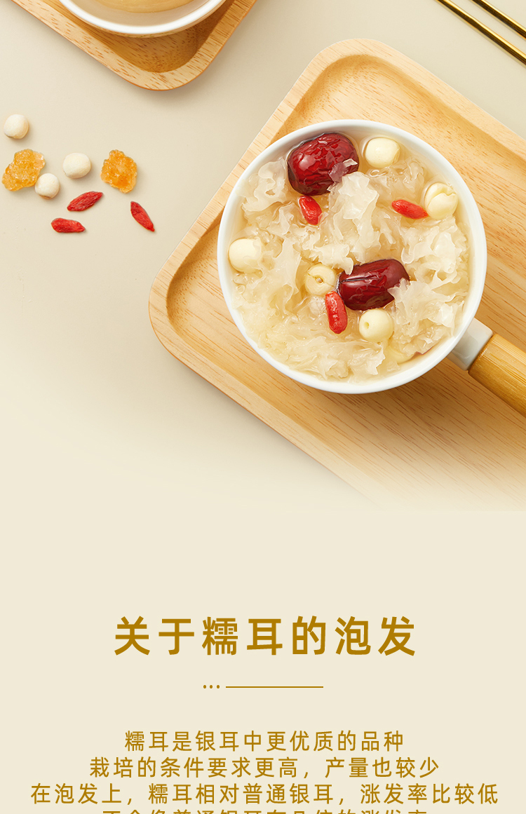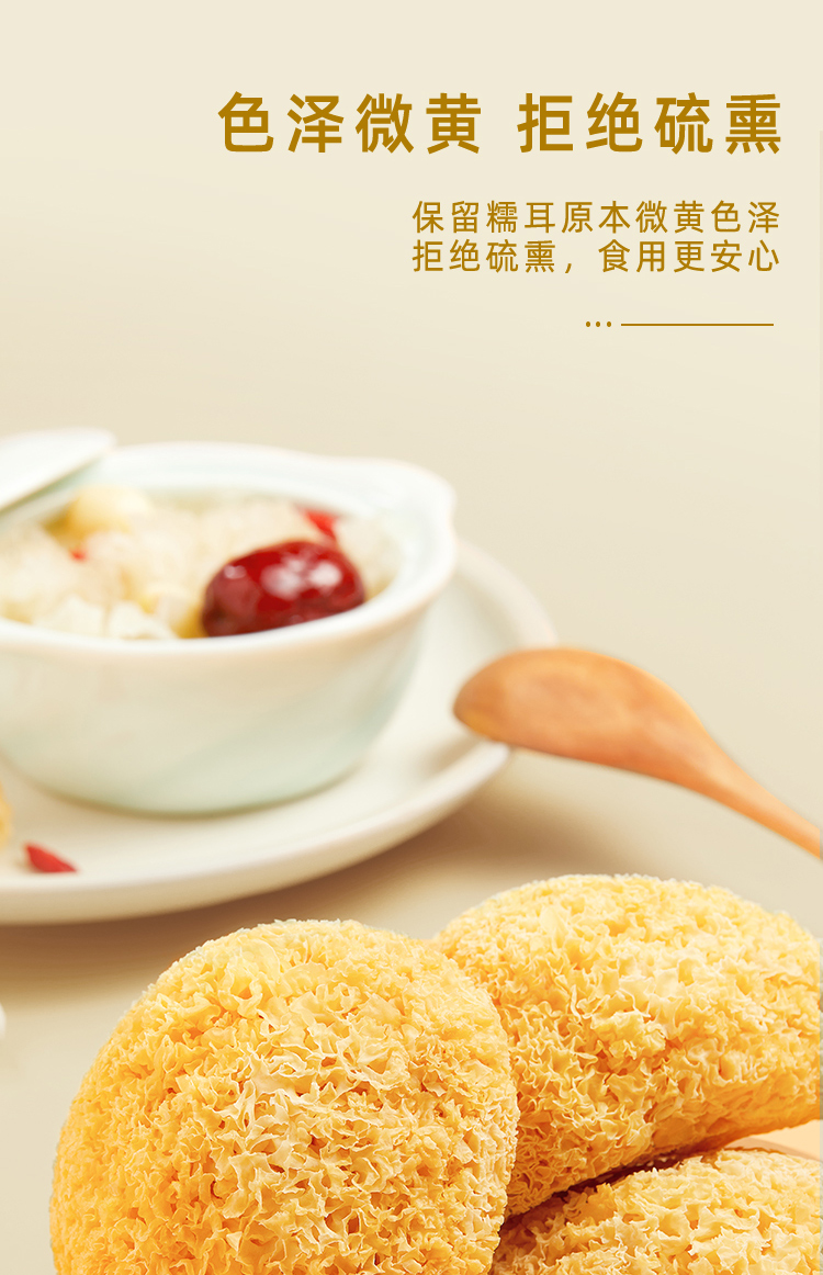 又称糯耳,软糯多胶,清香爽口,易煮易泡发,朵型紧致,小朵银耳,色泽微黄,保留糯耳原本微黄色泽,拒绝熏硫