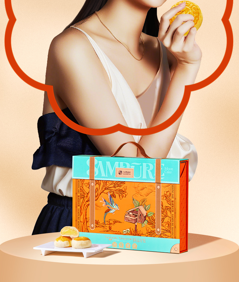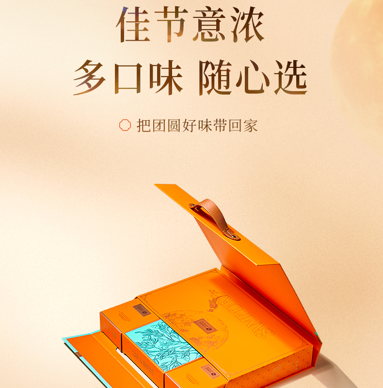 【卖点】:以复古手提箱包为设计灵感,搭配棕色皮质提手、扣带装饰,质感硬朗精致;吉祥鸟化作幸福使者,将思念与祝福传递;内含4式11饼9味,新式、苏式、广式、港式四种风格月饼,美味十足,让团圆时刻更甜蜜。
