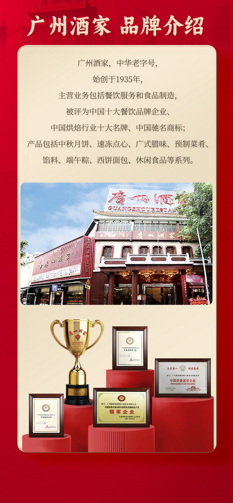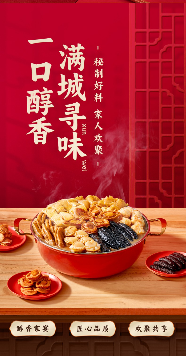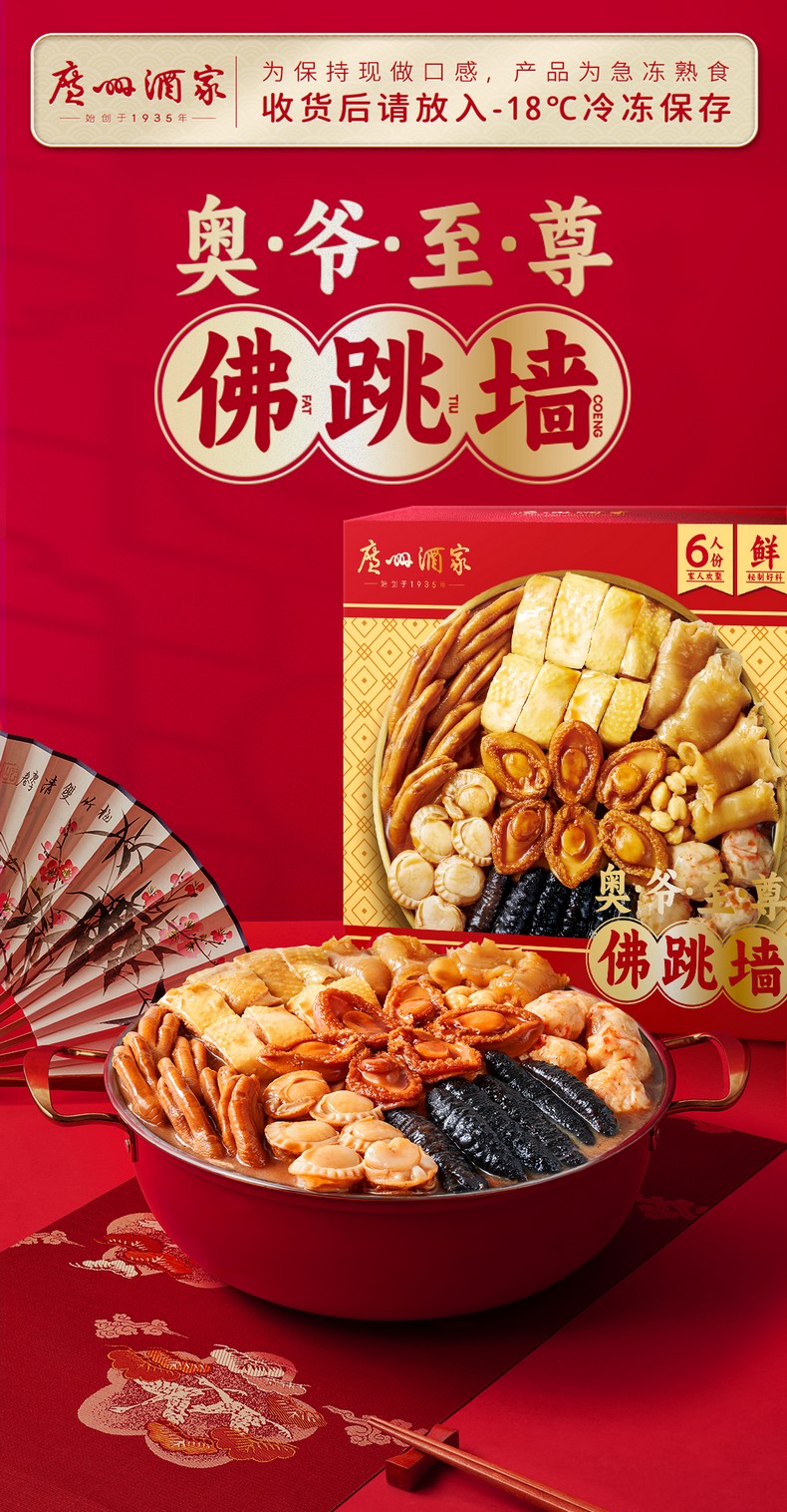 【广州酒家】海参(180-200头)、黄金鲍鱼(14-16克)、蟹鱼胶(30-40头)、帆立贝(40-60头)、卤鸭掌、鱼肉豆腐、仿龙虾丸、三黄鸡肉、花菇仔、莲藕、杏鲍菇、鹰嘴豆、鲍汁