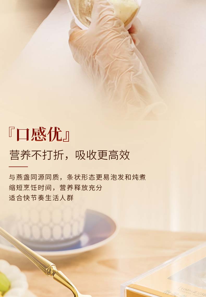 每片燕盏都源自印尼与马来西亚的自然馈赠,我们承诺,每一盏燕窝均为原产地直采,严格遵循自然法则,拒绝任何化学干预——0刷胶、0漂白、0添加,纯粹如初,100%纯天然品质保证。中国检验检疫科学研究院溯源码认证,一盏一码,每一盏都有独一无二的合法身份证,溯源保障、安心滋补。泡发出后的燕窝晶莹剔透、燕丝分明。