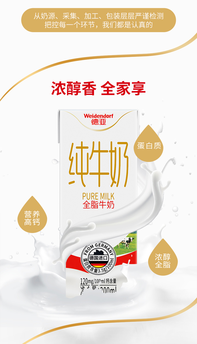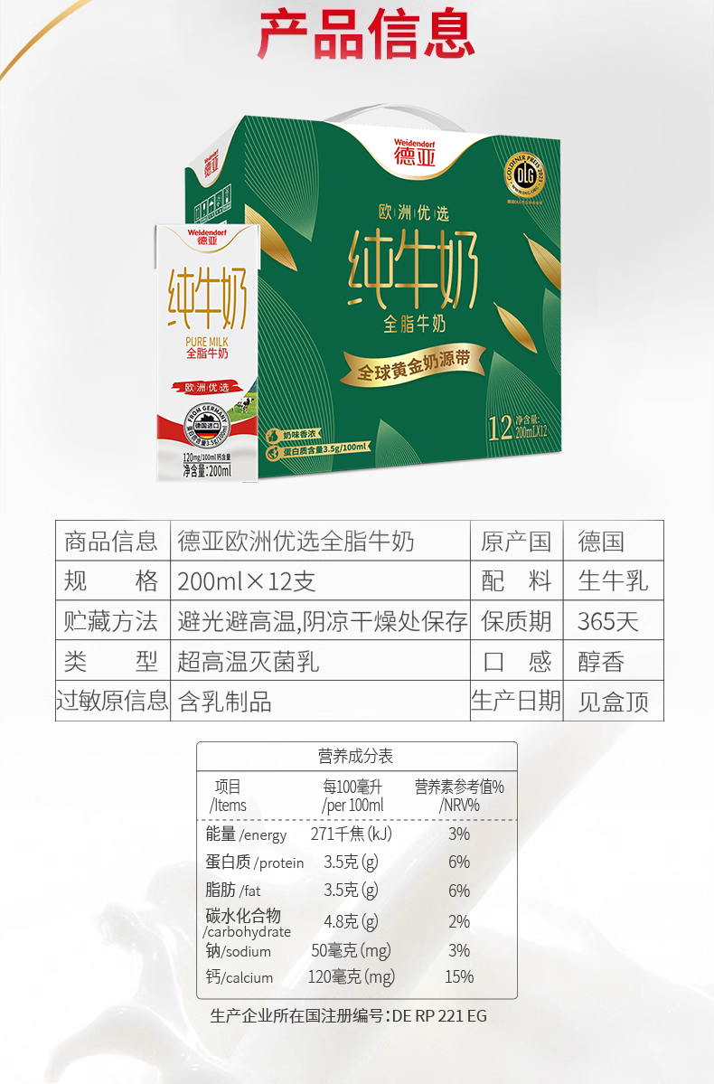 德亚欧洲优选(黄金奶源带)全脂纯牛奶200ml*12礼盒