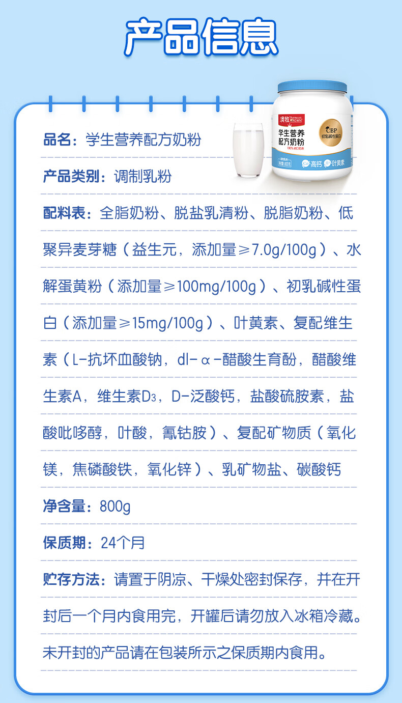 澳牧学生营养奶粉*罐装(800g)