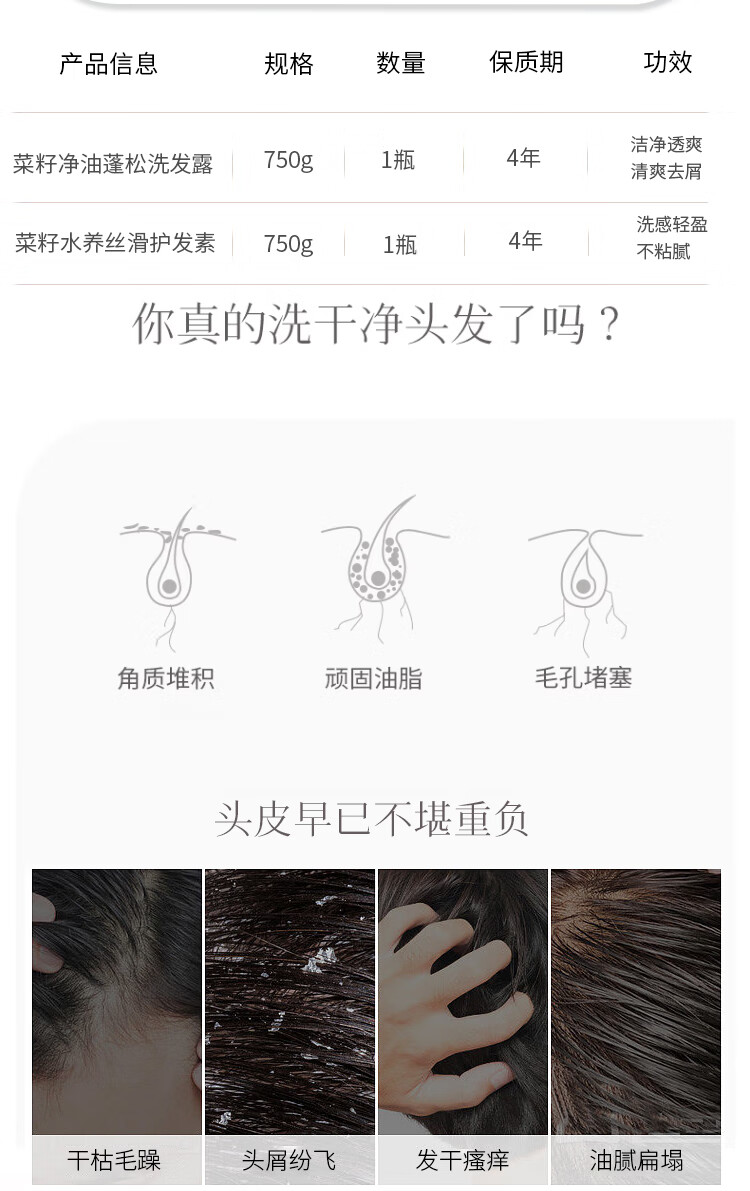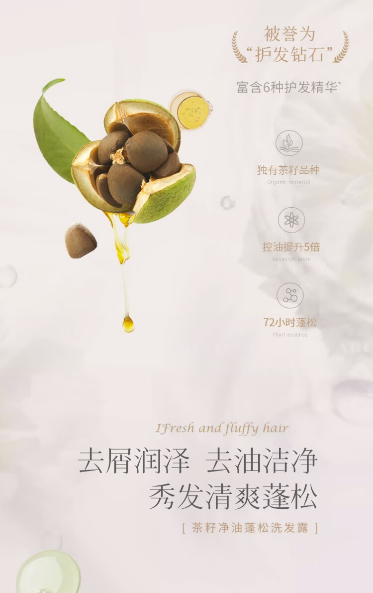 含有茶籽提取物,能够温和去除头皮上的油脂和污垢,彻底清洁头发和头皮,使头发清爽不油腻。