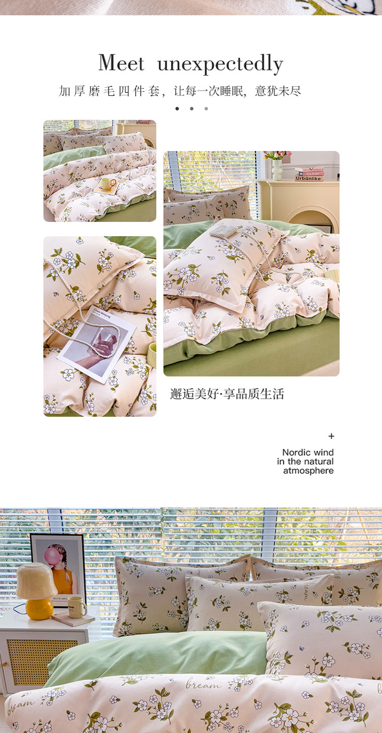 "每一根细丝都经过磨毛处理,面料厚实,做过缩水处理,面料挺括弹性强。拥抱这套磨毛四件套,就像投入了云朵的怀抱。磨毛面料结构紧密,抗起球、耐洗涤,久用不易变形、褪色,经得住日常频繁使用,长久保持良好品相,性价比出色 。
