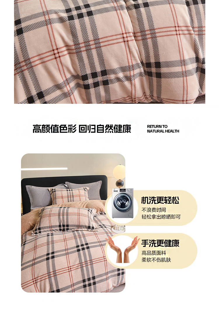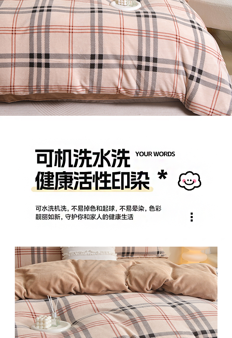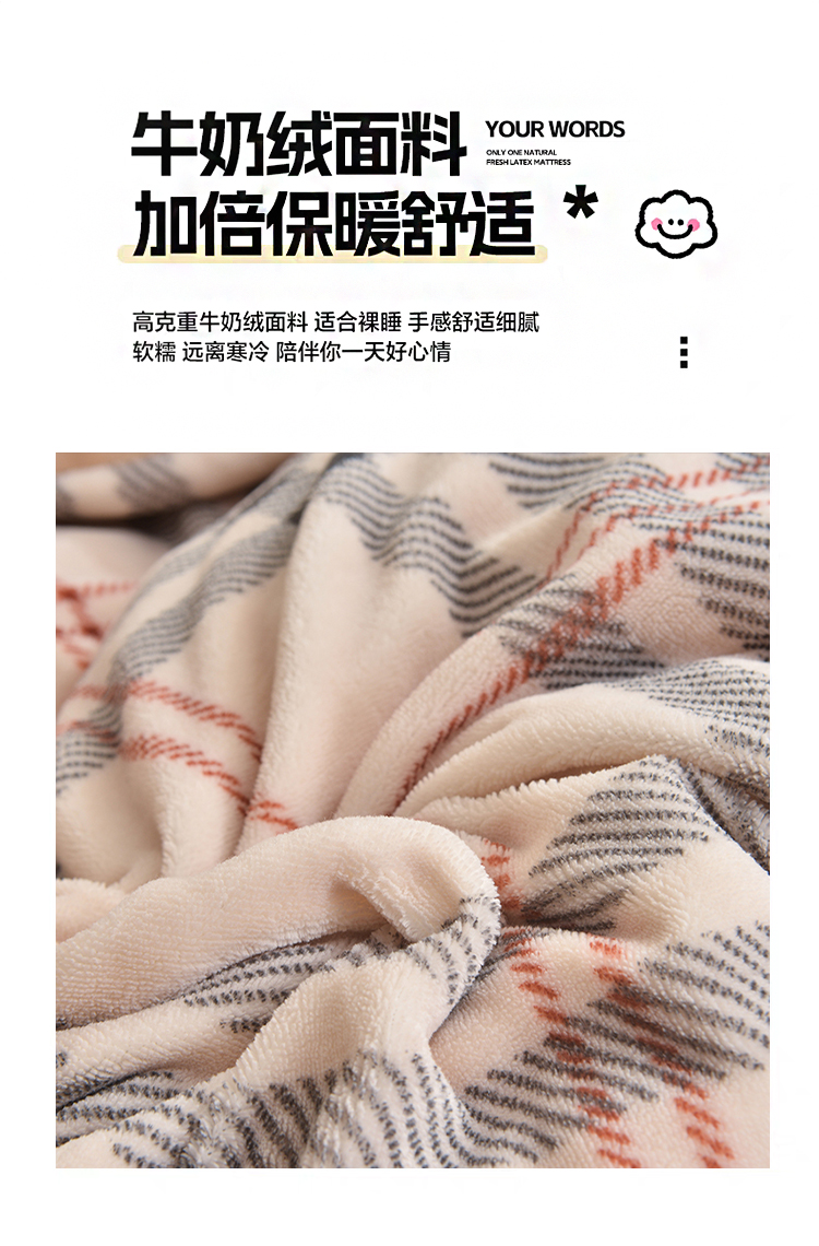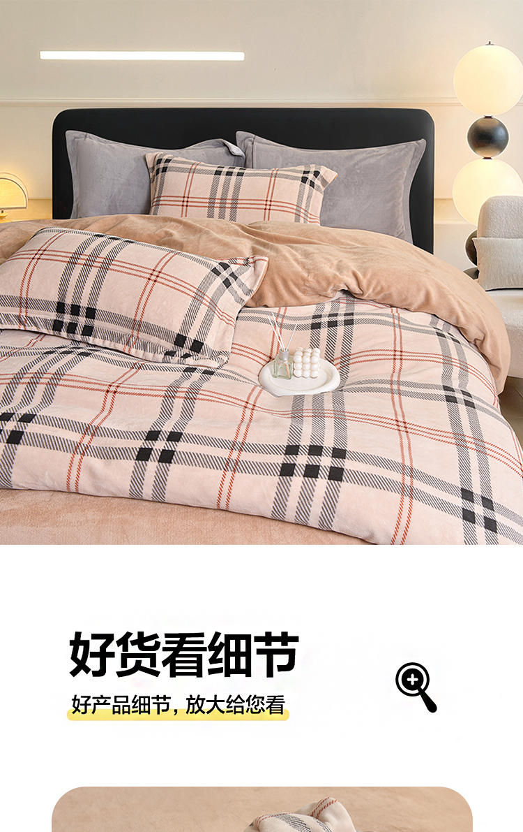 锁温黑科技:100%聚酯纤维+加厚拉绒工艺,形成密集保暖层,有效阻隔冷空气,整夜恒温不冰凉。经典拼色格纹(宝格丽经典色),复古与现代交融,轻松适配北欧、ins风卧室,视觉温暖感+50%。裸睡级触感:双面加密绒毛,柔软蓬松不扎肤,静电处理后贴身不粘毛,秋冬贴身更安心。