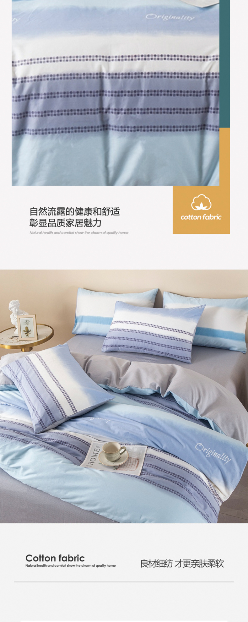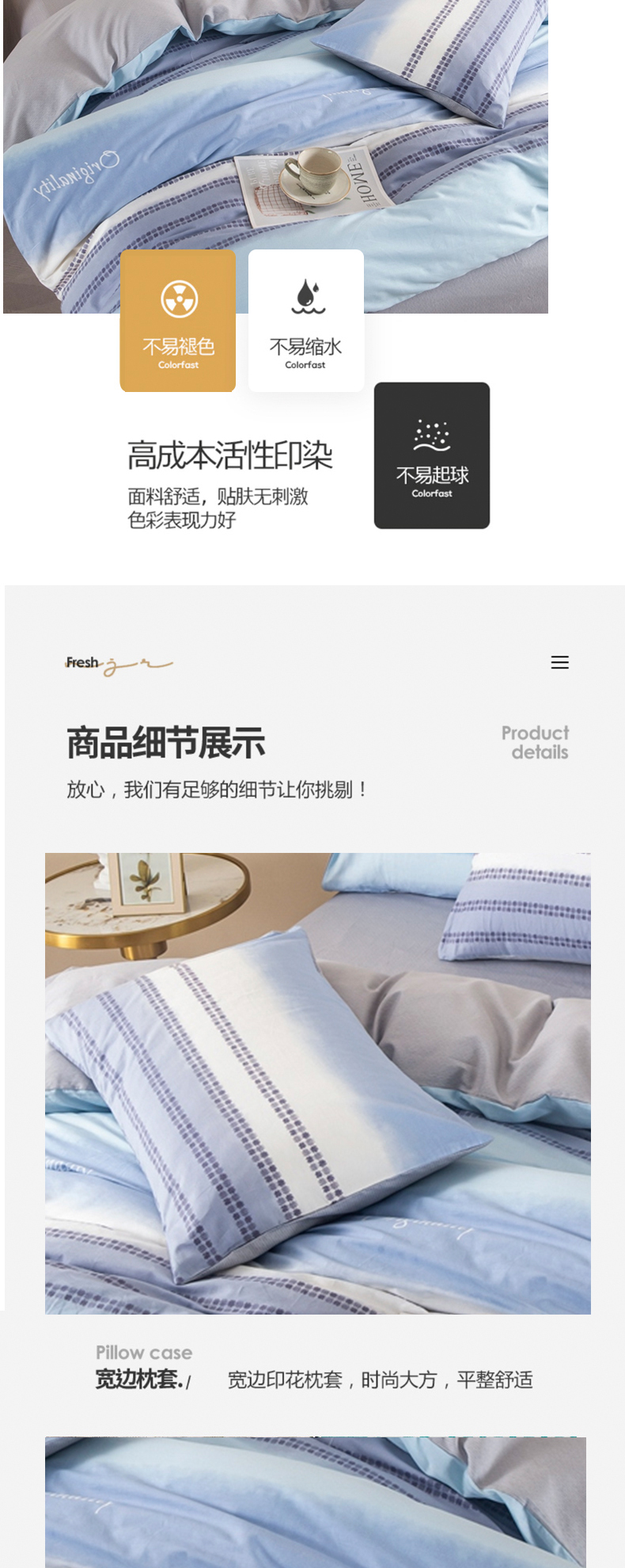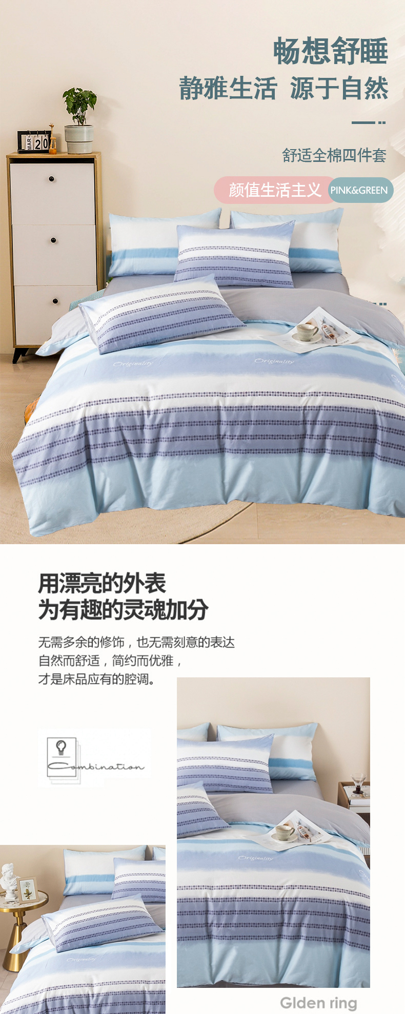 100%全棉材质,阳光全棉,40支纱倾心织造,触感柔软舒适,体感细腻亲肤 ,透气性优越,美观耐用,深受人们的喜爱。