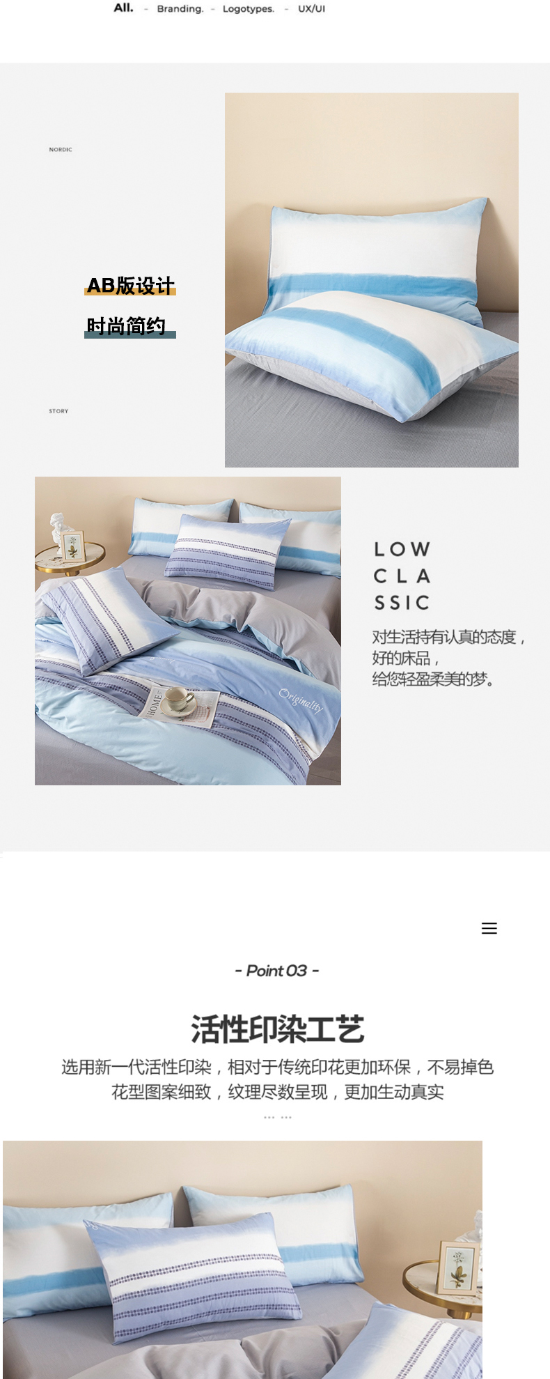 以蓝白条纹为基调,用活性印染加上星光点点,谱就出好看的肌理条纹,干净、整洁,简约蓝、白两色的碰撞拼接,色彩层层渐进,别具一格,既雅致又时尚。