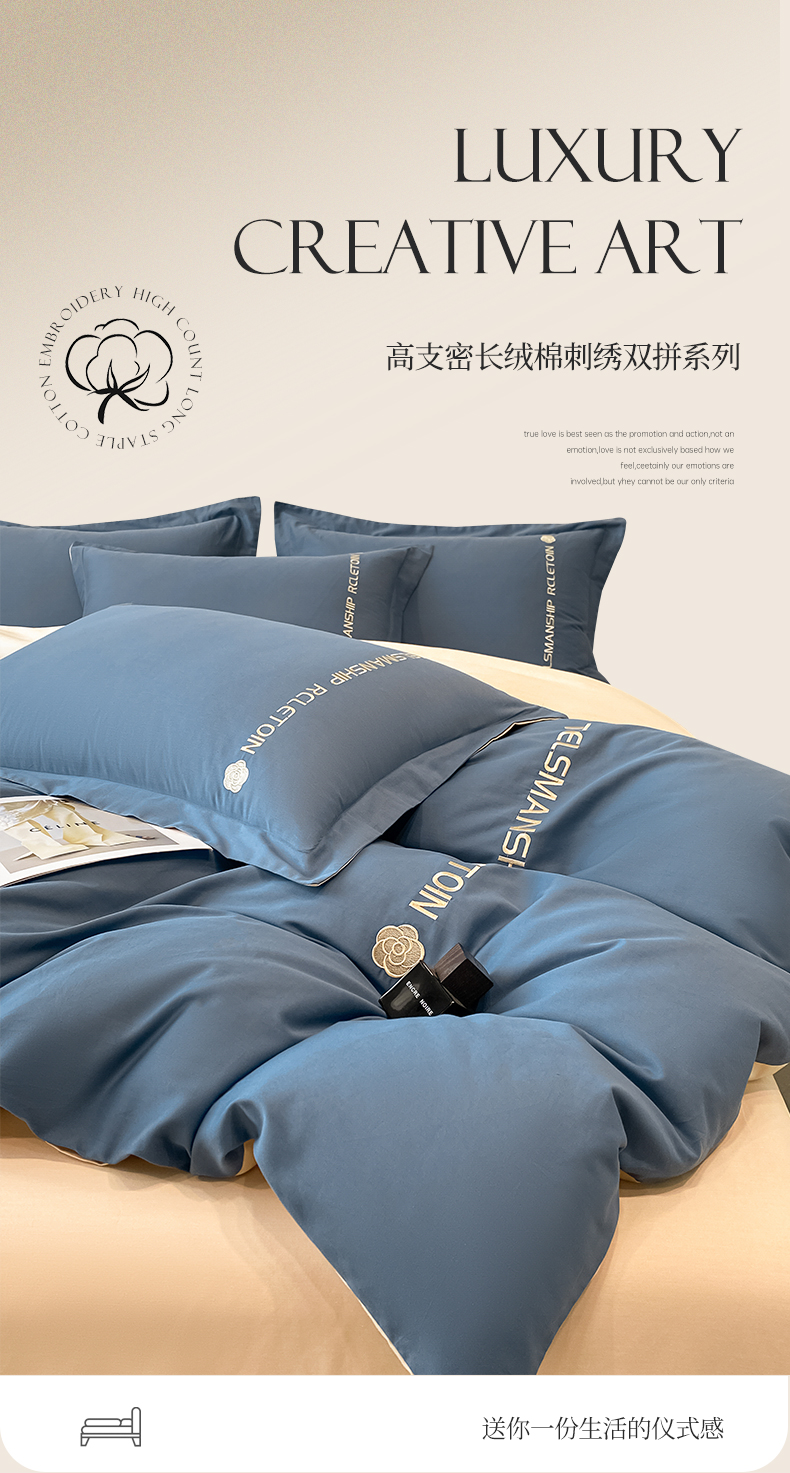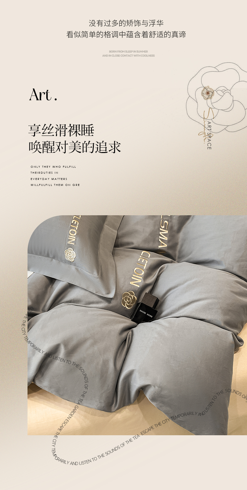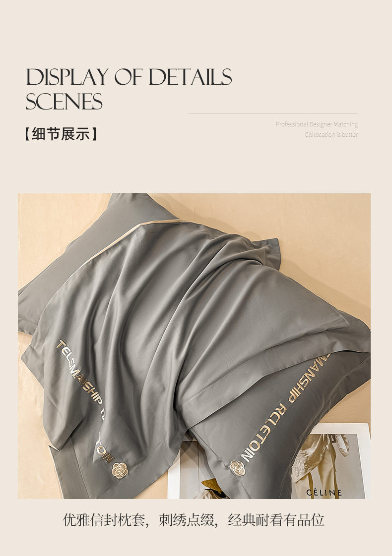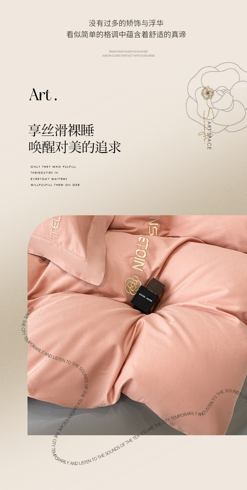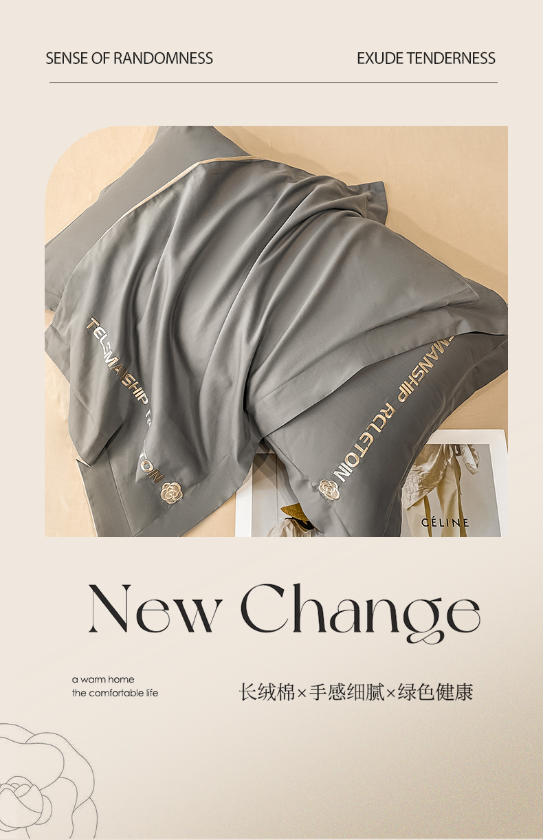 甄选高品质60支新疆长绒棉,平均生长周期比普通棉长10-15天,棉花更洁白饱满蓬松,无荧光,无甲醛,零污染生长环境,触感丝滑细腻,如丝如缎,泛着雅致的光泽感,不落世俗,时尚而尊贵。简约纯色风,精美山茶花刺绣,格调气质之选。
