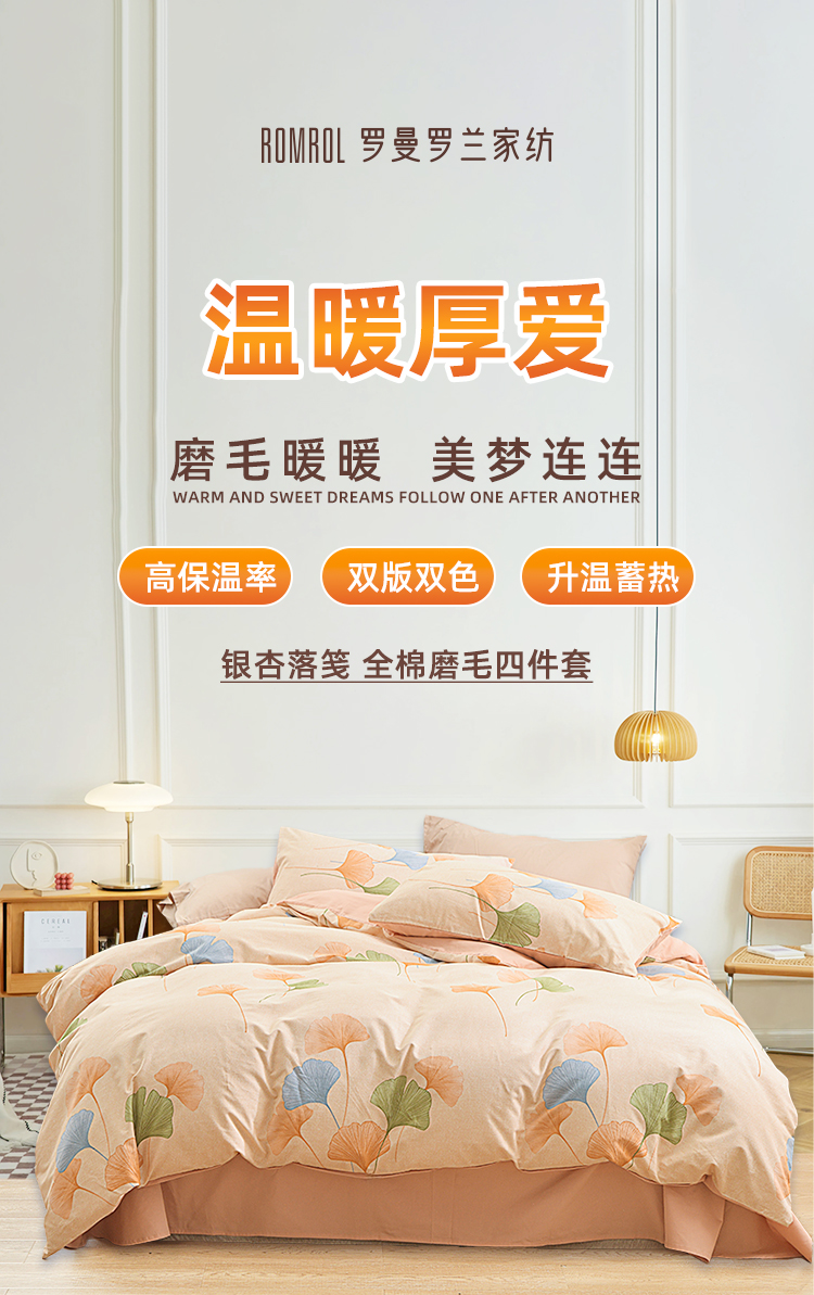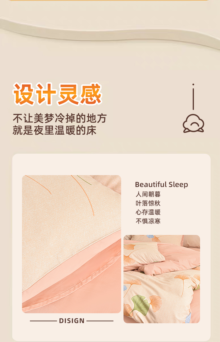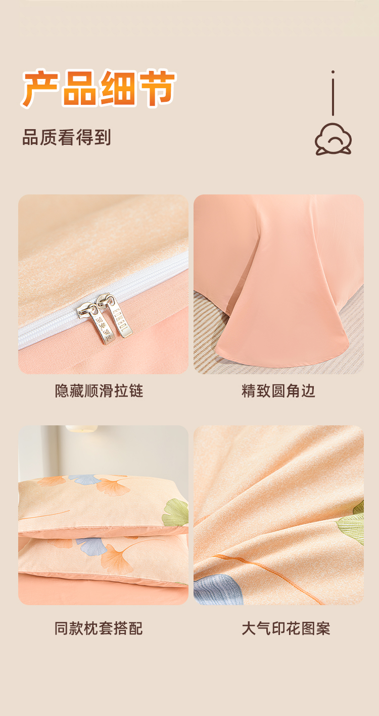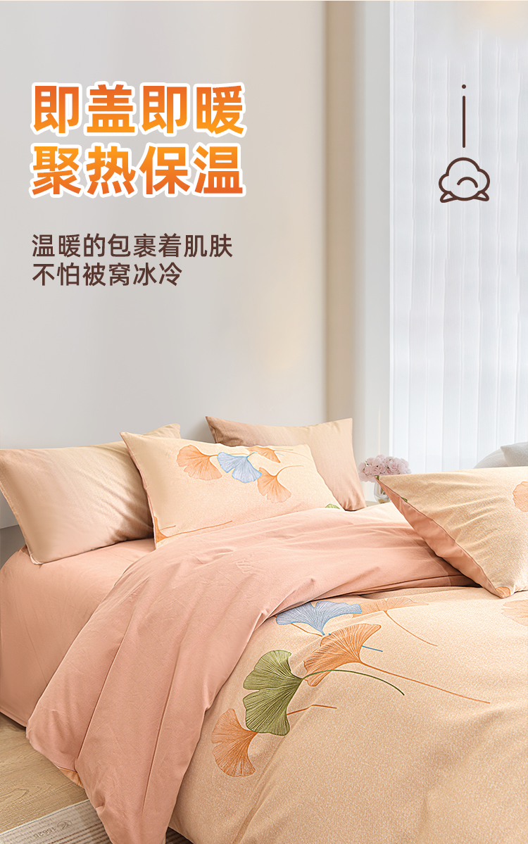 银杏落笺全棉磨毛四件套以自然美学与实用科技为核心,打造「会呼吸的温暖」睡眠体验。精选100%优质棉,经双面磨毛工艺形成细腻绒层,触感如初雪融化般绵软,秋冬裸睡不凉肤,春夏透气不闷汗。设计上提取银杏叶脉纹理,采用活性印染工艺呈现渐变暖棕色调,搭配隐线包边细节,既保留自然野趣又彰显现代极简格调。被套被角带设计防移位,经多次水洗测试仍保持柔软如新,让每一夜都沉入银杏色的温柔梦境。