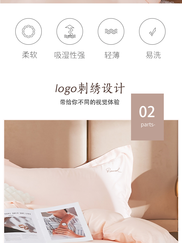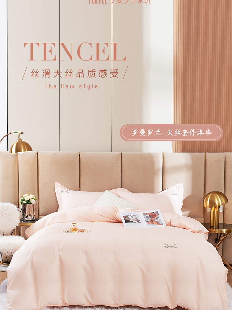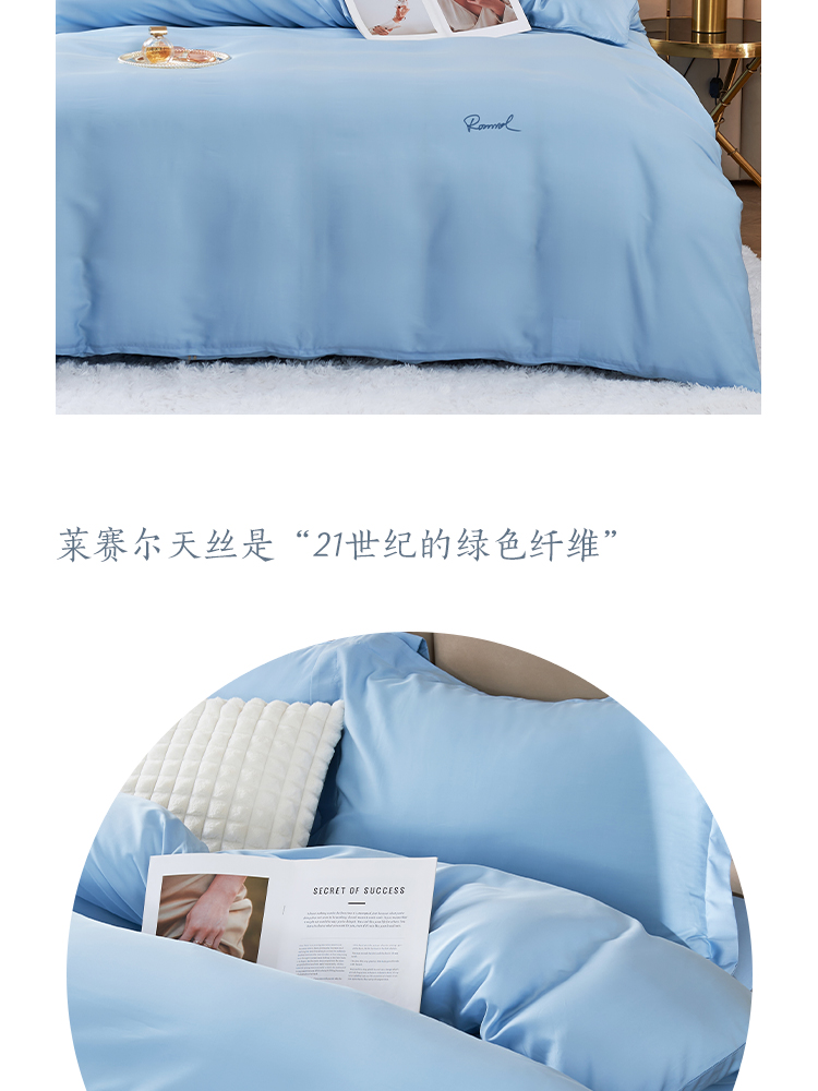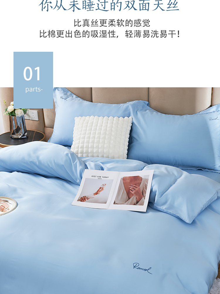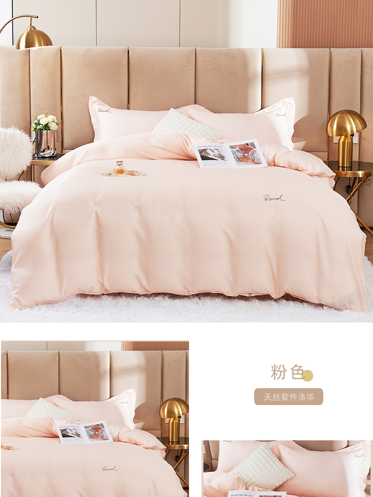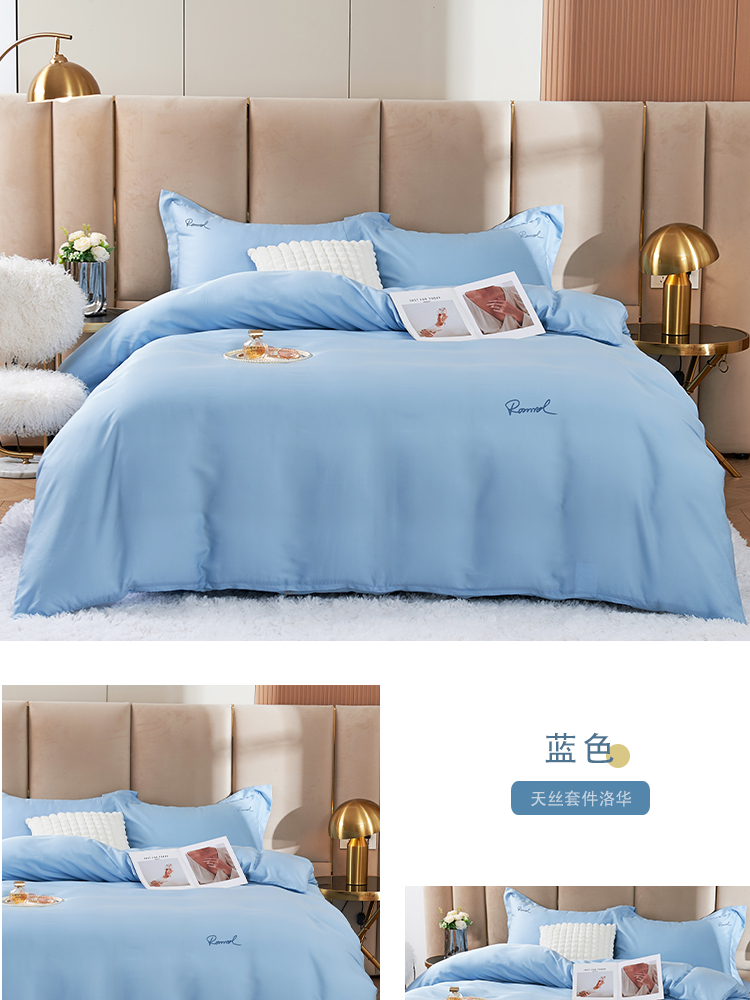 莱赛尔面料,触感柔滑舒适,让您感受家的温馨与舒适。每一处细节,都流露出对品质的执着追求。为您的卧室增添一份别致韵味,纯色简约时尚被套枕套,时尚绣花logo图案,天丝四件套,让您拥有一个温馨、舒适的睡眠环境。