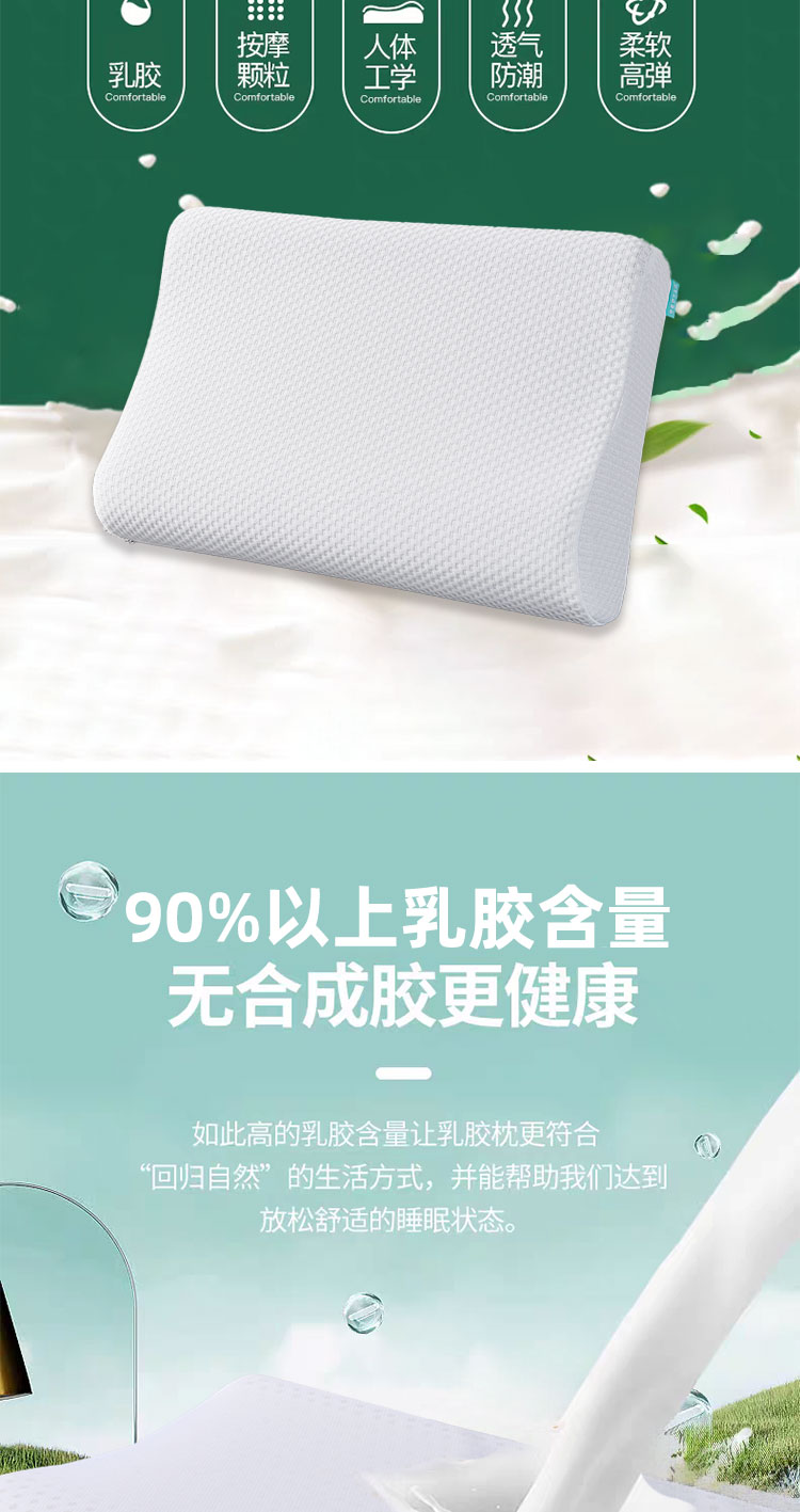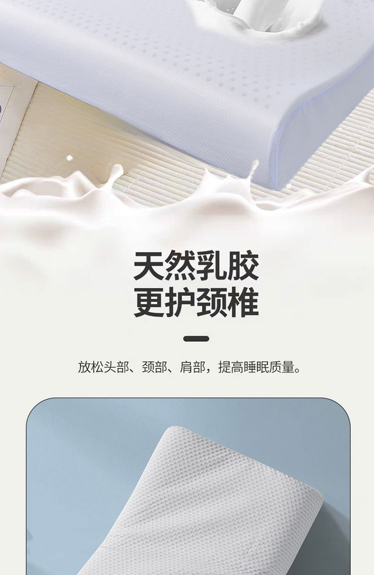 这款曲线乳胶枕采用93%天然乳胶制成,具有独特的曲线设计,完美贴合头颈肩曲线,实现智能分区支撑:颈部加高区强化承托,头部凹陷区释放耳廓压力,无论是侧睡还是仰睡都能保持脊柱水平对齐,有效缓解颈椎疲劳;其天然乳胶材质抗菌防螨率达99%,透气孔结构快速排湿散热,四季保持干爽舒适,一体成型工艺确保耐久性,经5万次压力测试不变形,0甲醛0胶水符合母婴级安全标准,高弹性分子结构还能吸收翻身震动,减少伴侣间的睡眠干扰,显著提升深度睡眠质量。