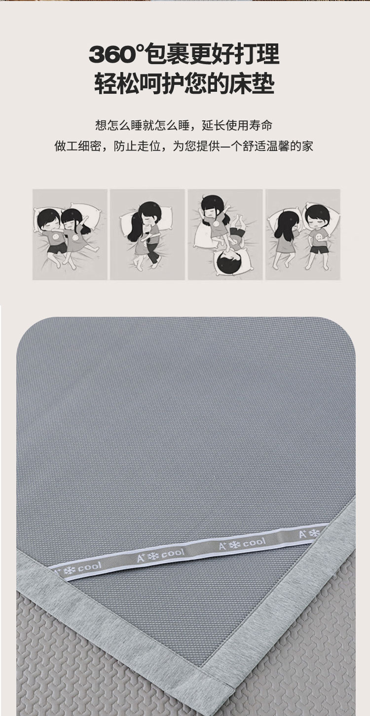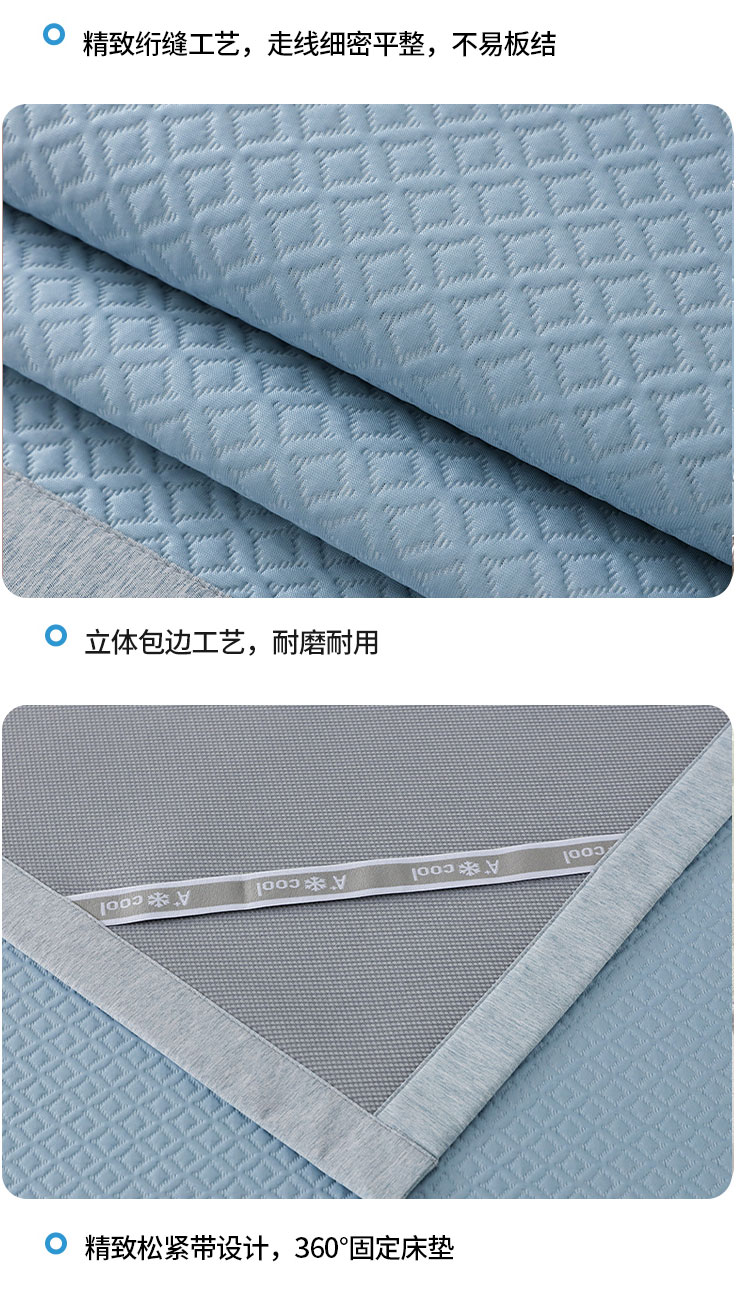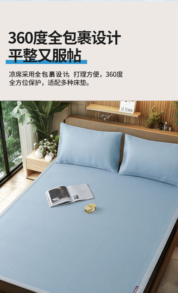 3秒触感降温,凉而不冰:采用高密度冰丝纤维与清凉因子科技,接触瞬间体感温度直降3-5℃,如薄荷清风拂过肌肤,持续散热8小时,整夜舒爽不闷热,空调房搭配使用更省电!