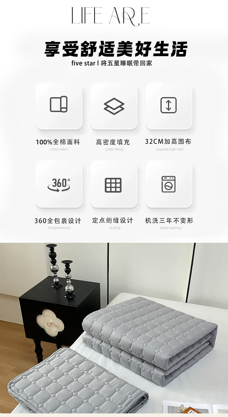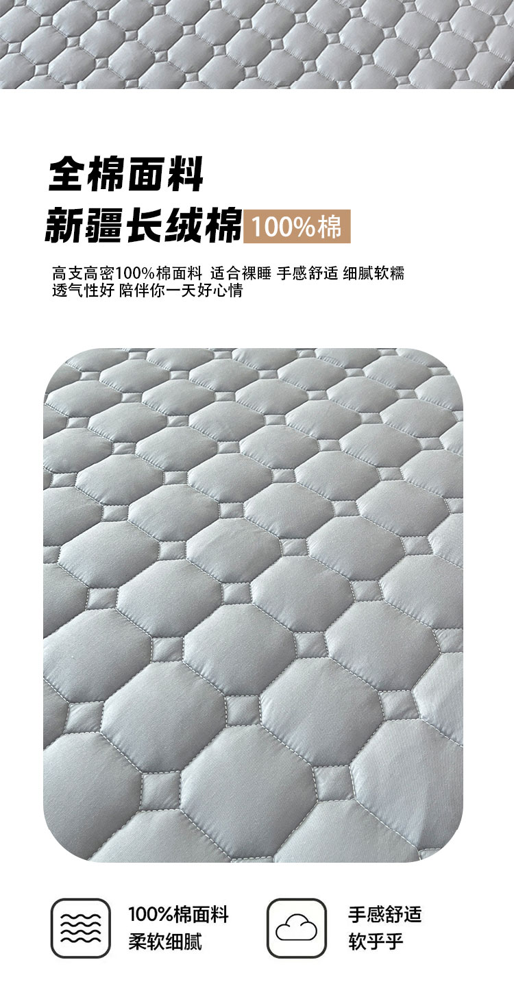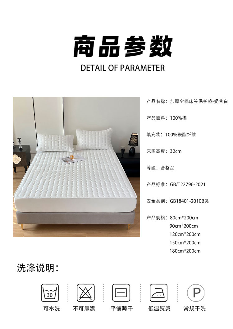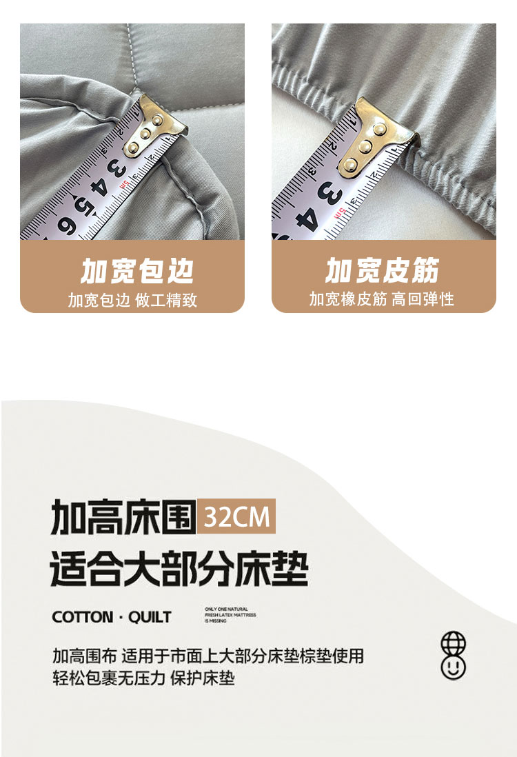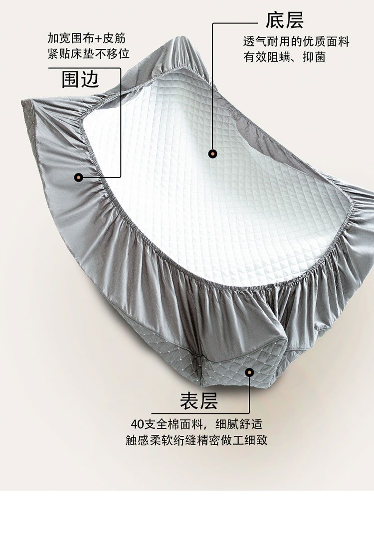 采用优质全棉面料,触感柔软细腻,亲肤性极佳,可抑制螨虫滋生,对敏感肌肤友好。天然棉材质透气吸汗,能保持睡眠环境干爽,避免闷热潮湿,提升睡眠舒适度。床笠式360°全包围设计,整圈松紧带包裹,稳固不移位,有效阻挡灰尘、污渍、油渍等侵入床垫,日常的饮品泼洒、灰尘堆积都能被床笠隔离,减少床垫清洁负担。32厘米加高床围,适用绝大多数床垫,轻松包裹无压力。
