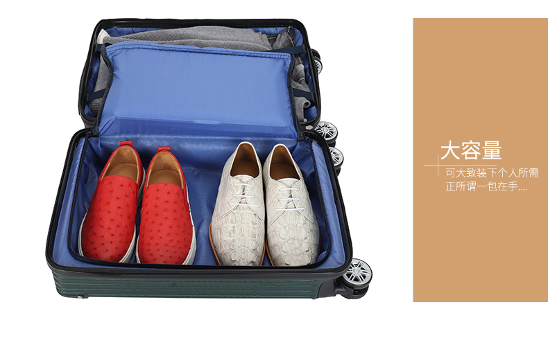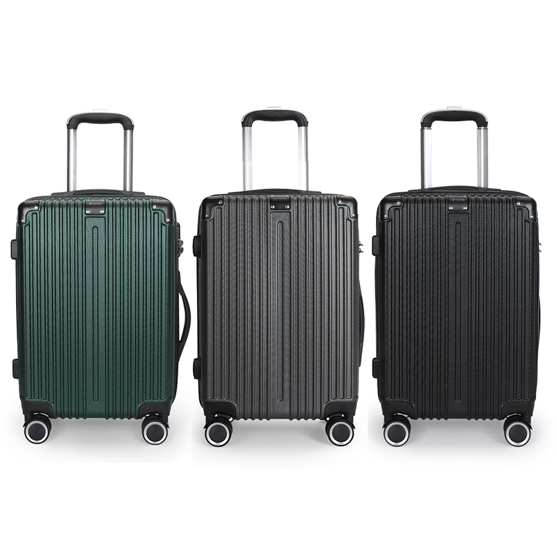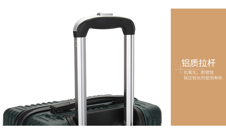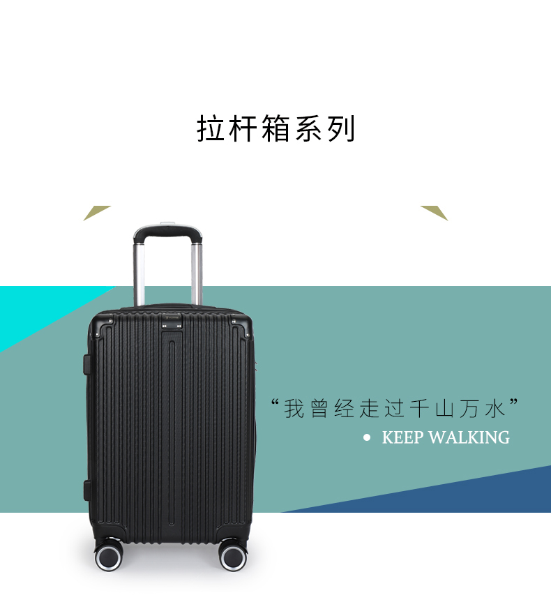 主材料采用ABS加厚,前置包角防撞防划,竖条纹设计增加箱体的承重能力,自动回弹软提手提高使用舒适性,双轱辘四轮万向轮稳固耐用,三位密码锁设计保护你的物品安全,铝合金拉杆防锈耐用,内置X型物品固定带,物品隔层设计