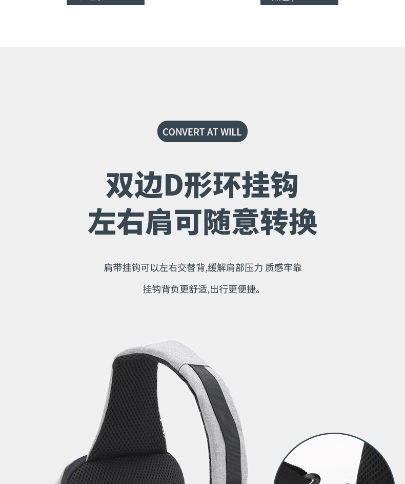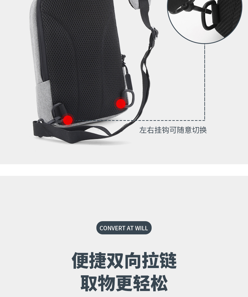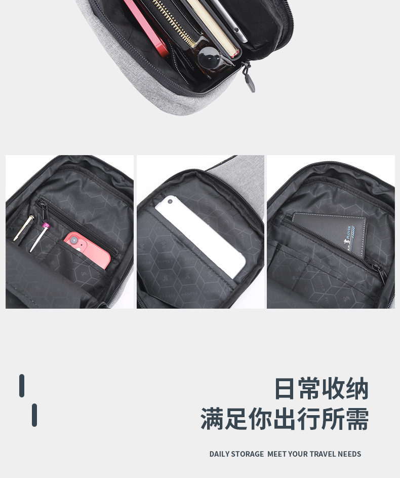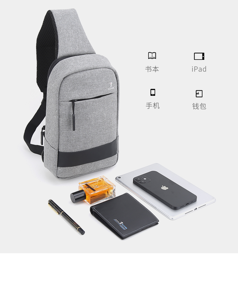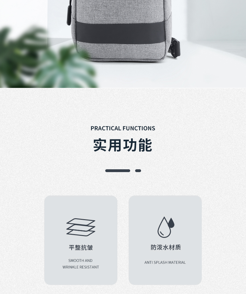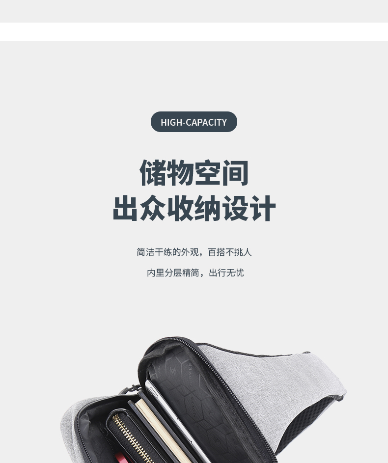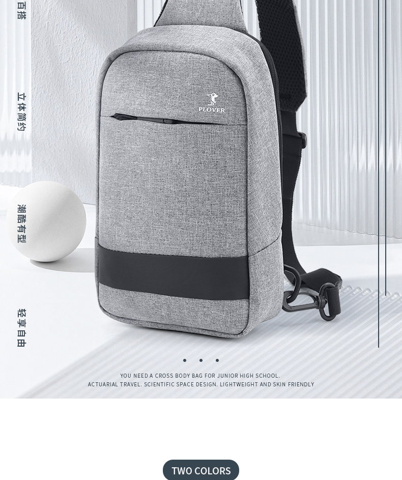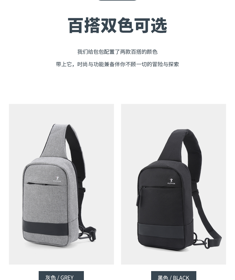 简约有型,时尚百搭!胸包材质选用防水牛津布,满足日常的生活防水,整体设计轻量简便,空间充足携带灵活;主储物空间大,分区收纳的设计,小物品的取放也方便。非常适合短途出行,户外休闲或者上下班通勤都很适合。选一款胸包轻装上阵,出行才不会有负担!