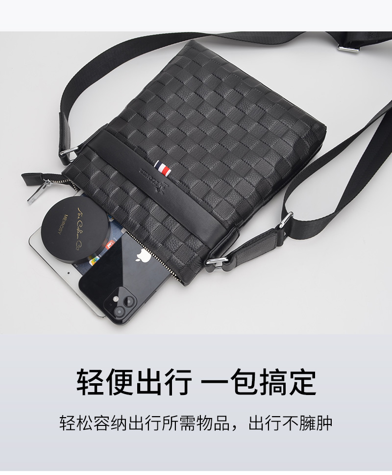 本产品采用特优级头层牛皮制作,方格纹理,面料经久耐用,搭配靓丽五金配饰凸显产品的高贵气质,背面五金拉链袋设计方便物品取放。