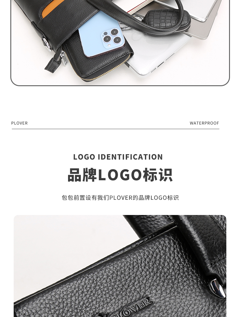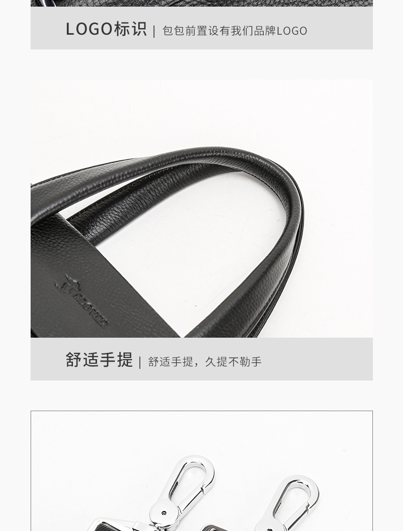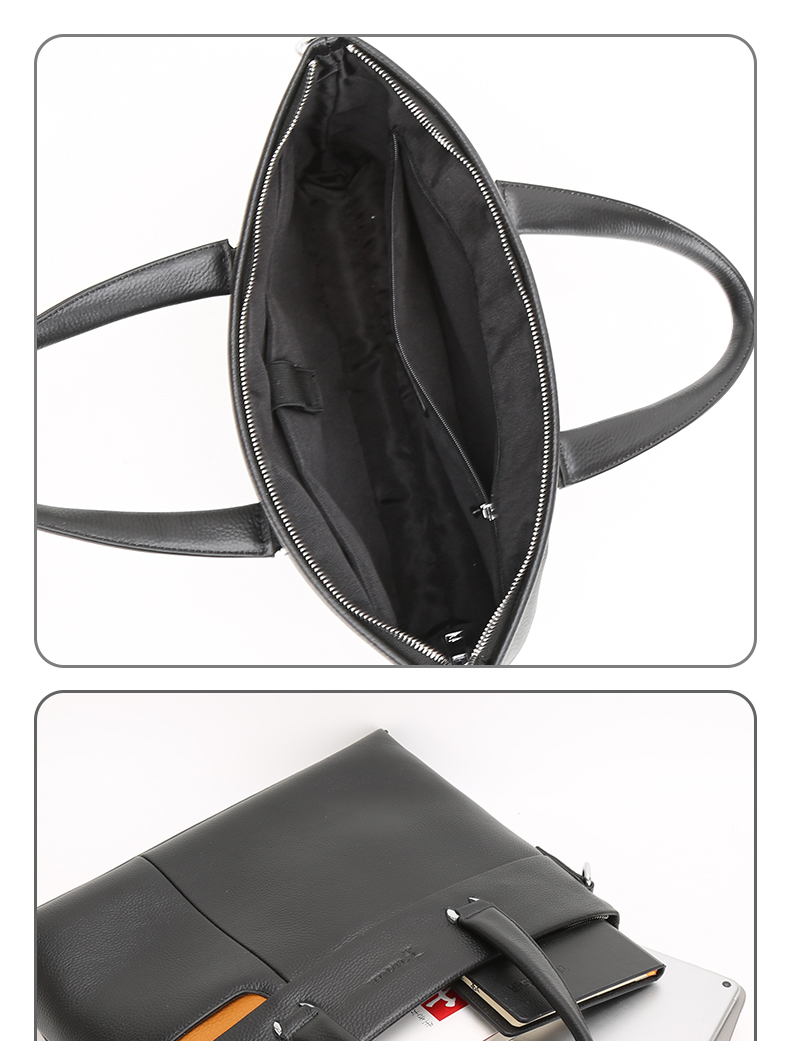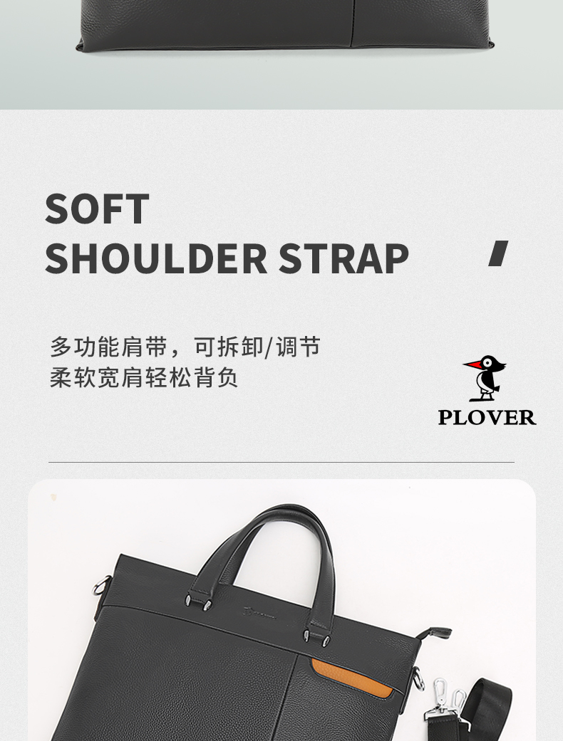选用舒适柔软的头层牛皮,纹路清新自然,前右上搭配手机袋,内侧设计有电脑卡位,方便用户将洽谈业务所需要用到的电脑位置。可拆卸可调节抗压负重形肩带,美观牢固适合!