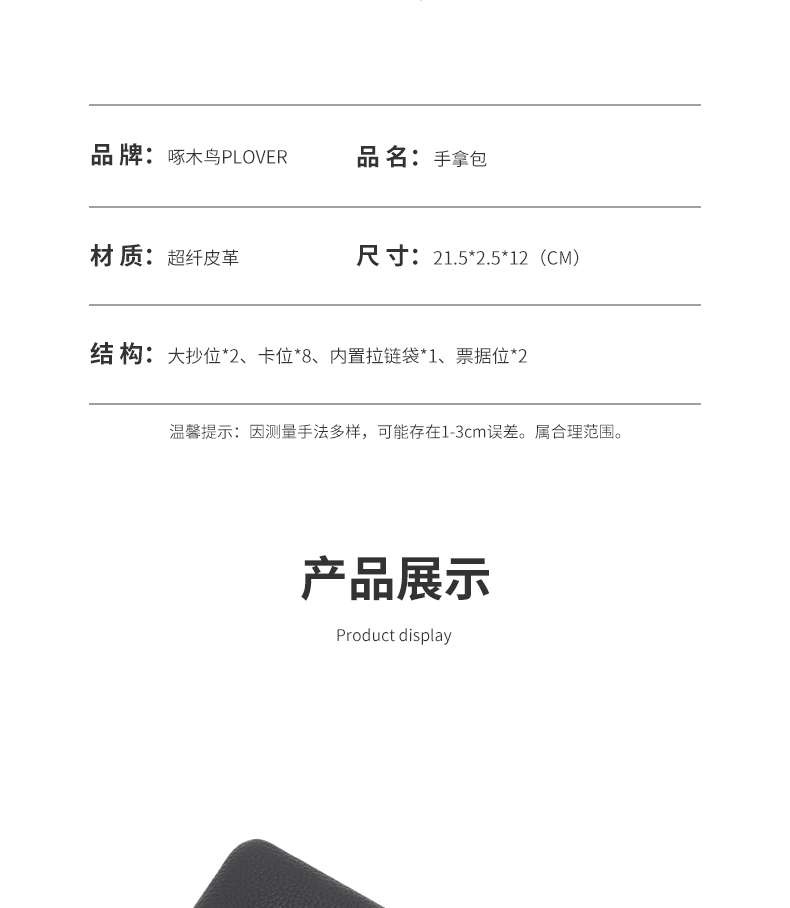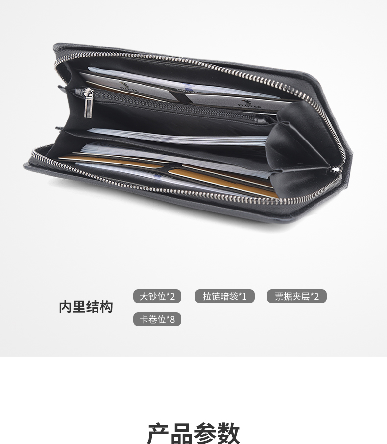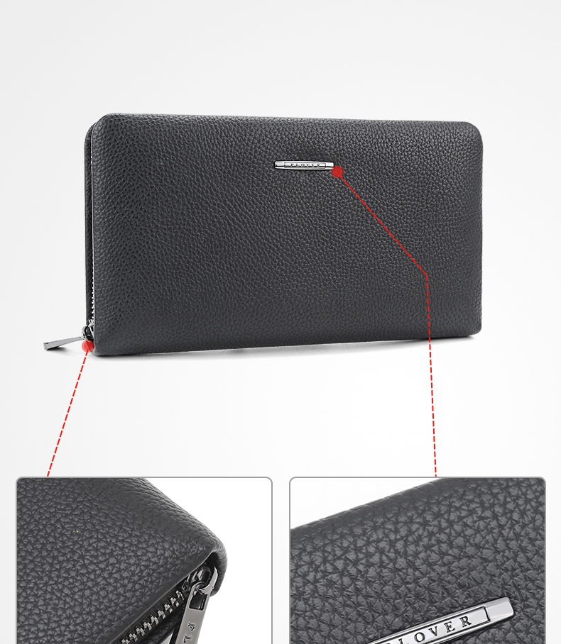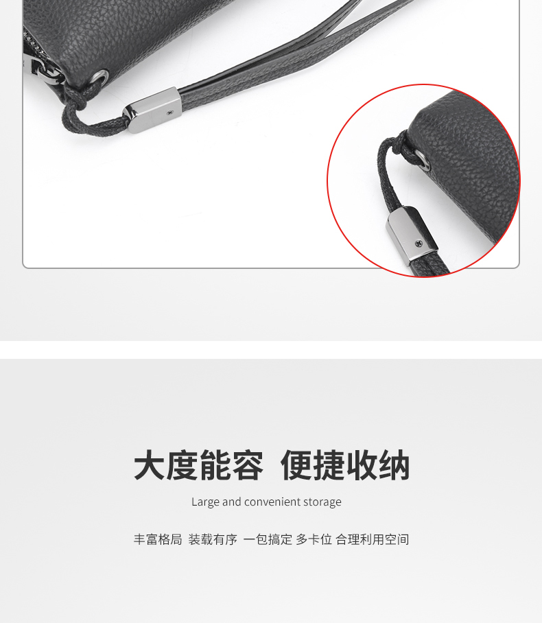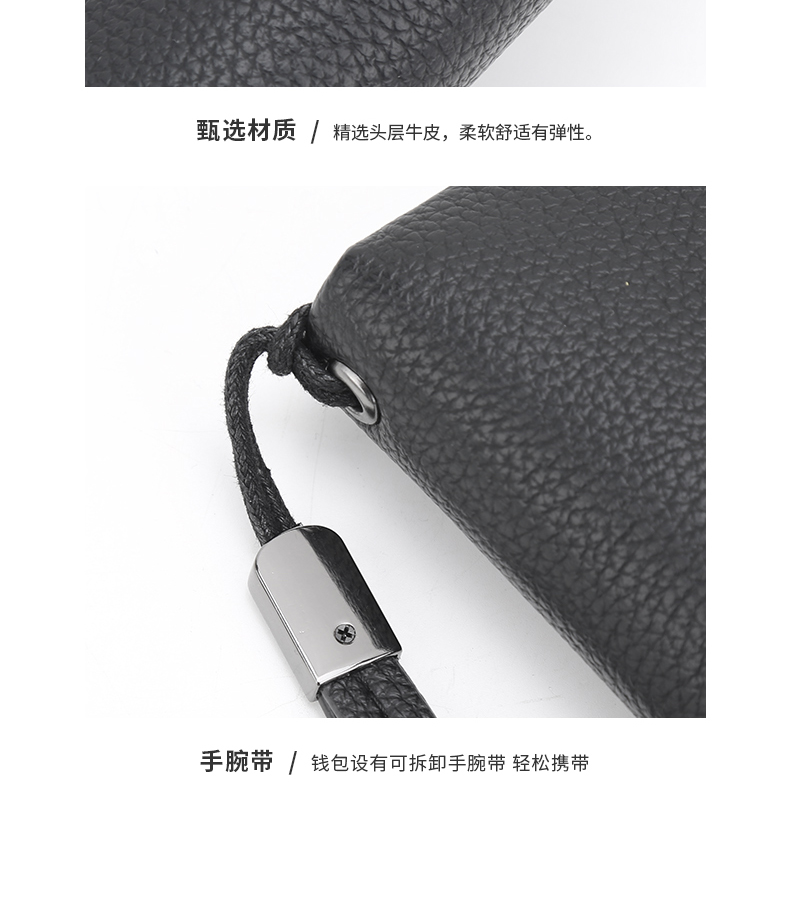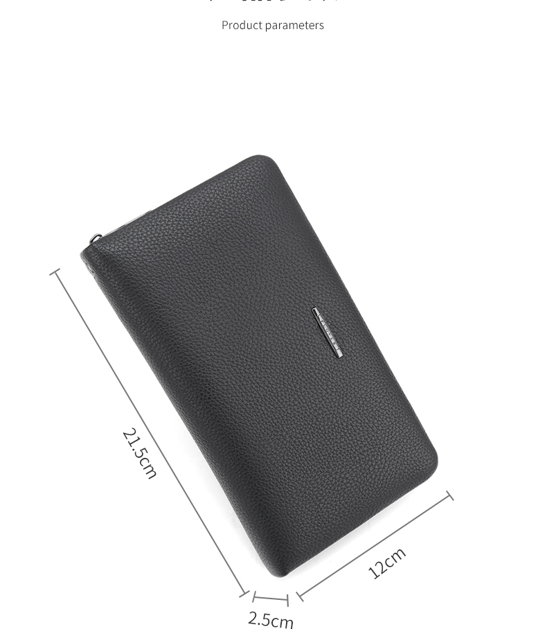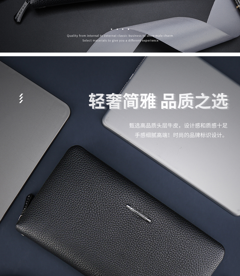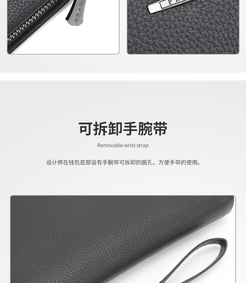 设计感和质感十足,手感细腻高端!时尚的品牌标识设计。超大容量内部设计多卡位,拉链暗袋,手机袋,夹层拉链袋,证件位。男士手拿包,让你的生活更有品味!