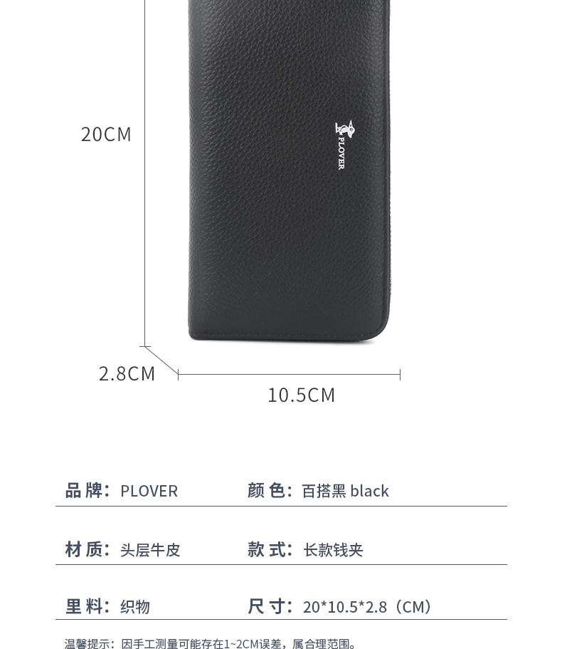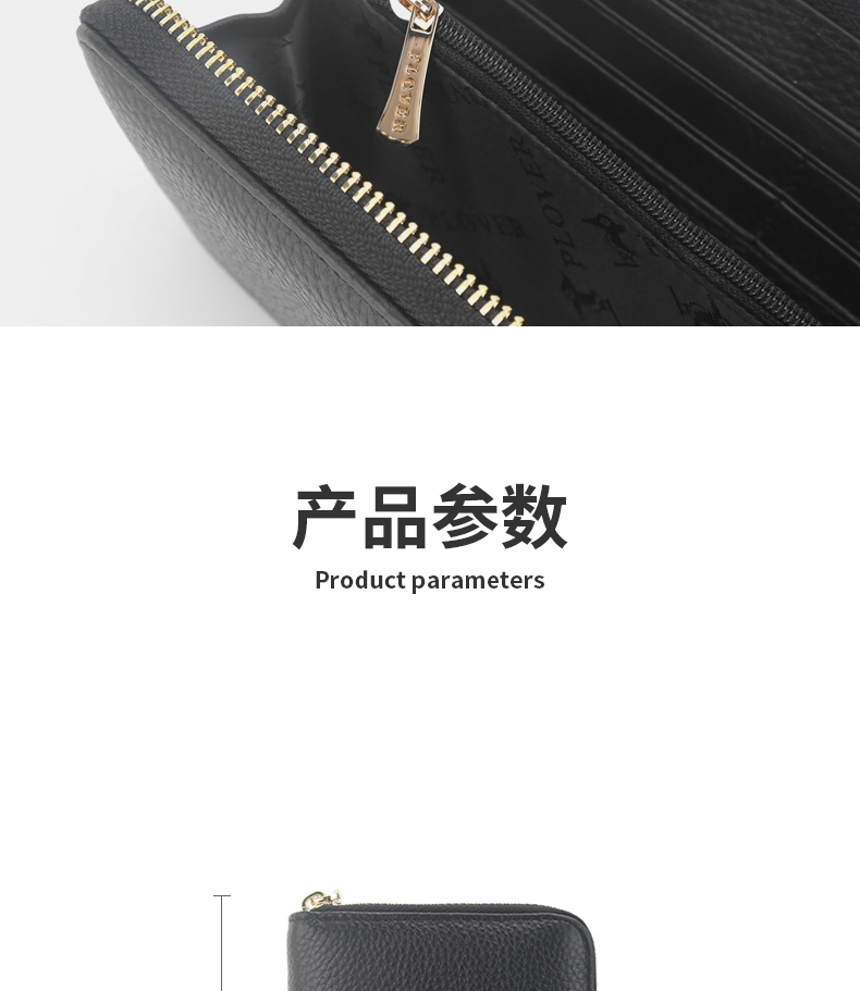 精选纹理清晰的头层牛皮,品牌标识立体清晰,优质的五金配件抗氧化,内置12个银行卡位,两个侧边票据位,2个大钞位,1个拉链袋,满足您的日常需求