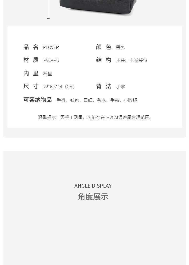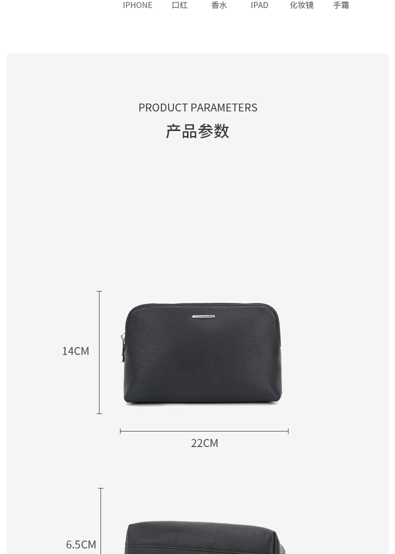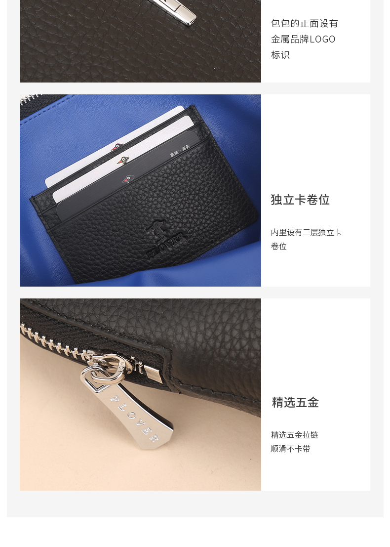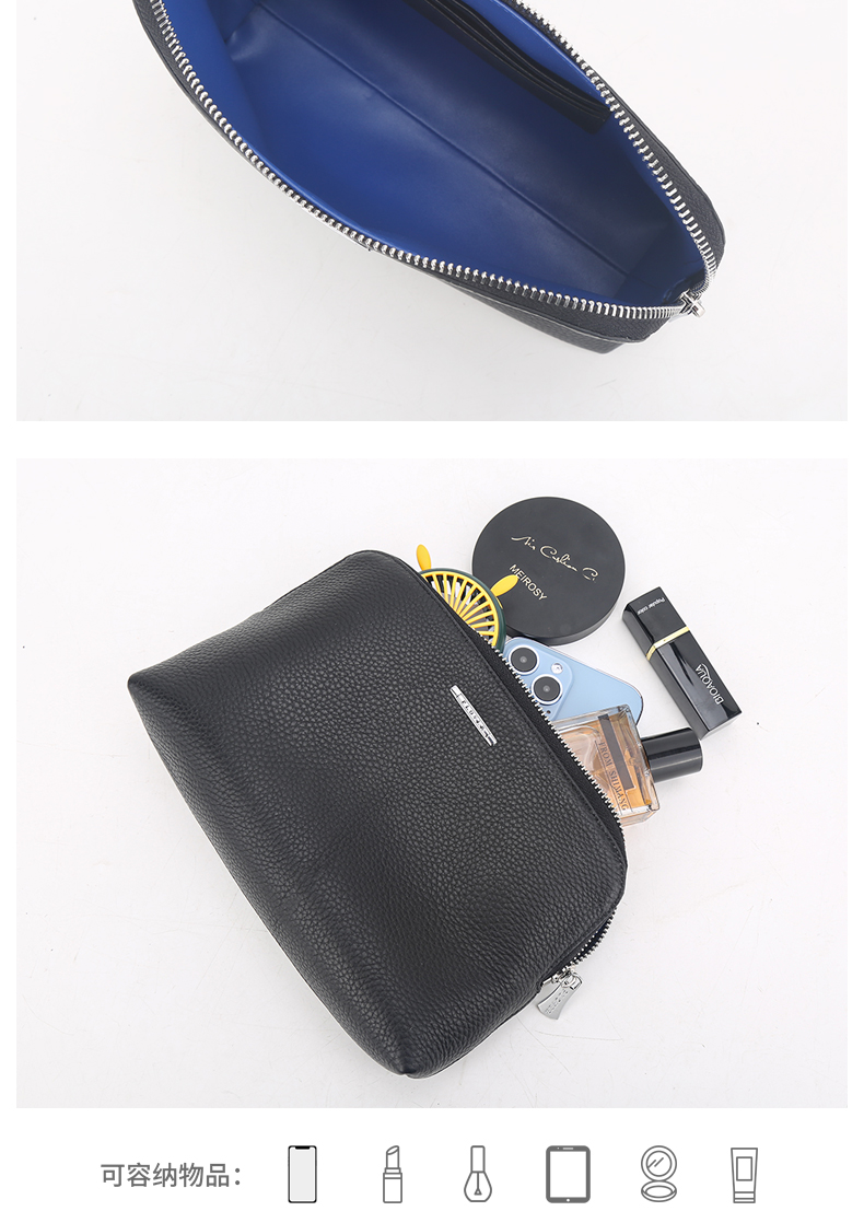 手包面料精选纹理清晰细腻柔软的头层牛皮,优质的五金配件顺滑的拉链来回自如!内格撞天蓝色超纤,耐用,内设3卡位.简于优雅!