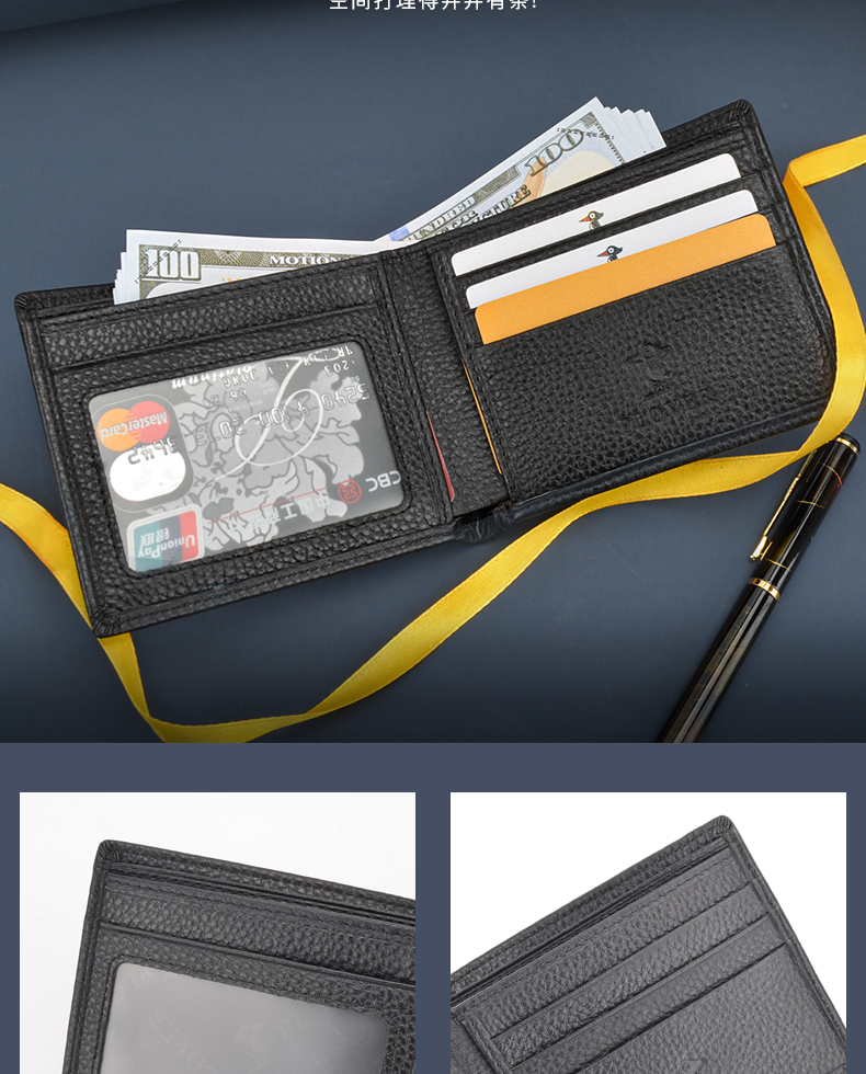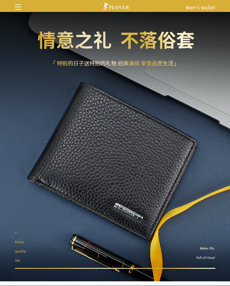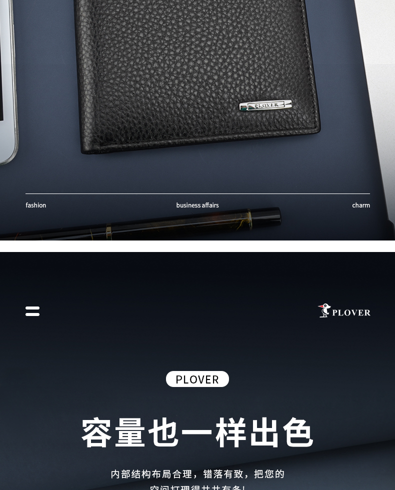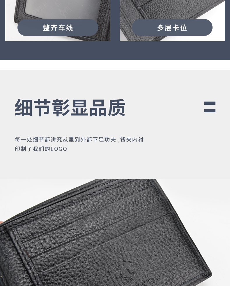 采用头层牛皮制作,耐磨不掉皮,包身加固车线,对工艺精益求精,大面优质金属品牌标识,内部压印品牌标识,专用防伪品牌衬布,多功能内袋设计,商务与休闲出行两不误