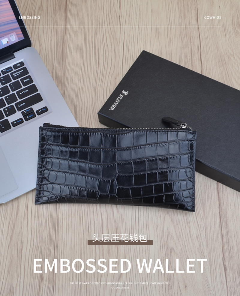 主面料采用头层牛皮压印鳄鱼纹路,后拉链袋设计加大空间使用,优质铁牙拉链,齿牙紧密,反复拉合顺滑无阻,内部附大钞位、6卡位设计,附1拉链暗格袋,小体积,大作用