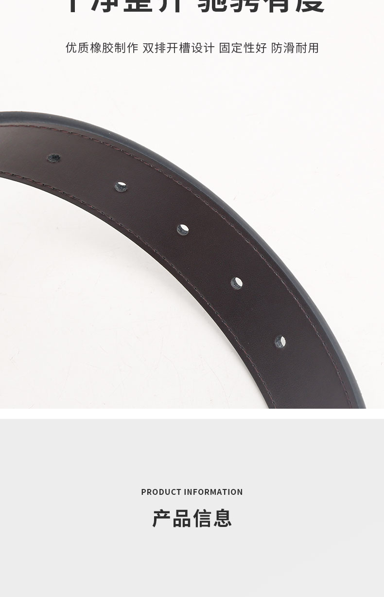 锌合金五金扣头,真空电镀工艺,激光雕刻纹理+压印品牌logo,带身采用二层牛皮,车线油边工艺更加耐用,带身尾部采用热压印logo工艺。
