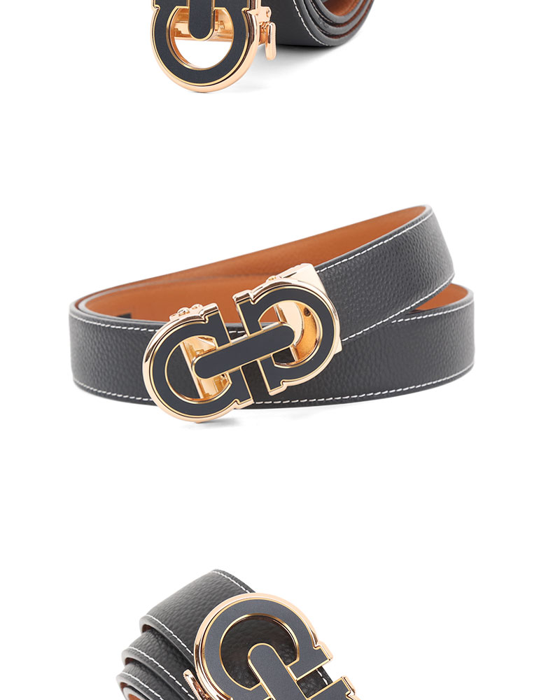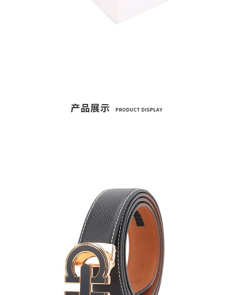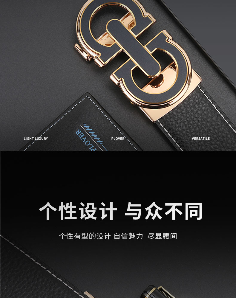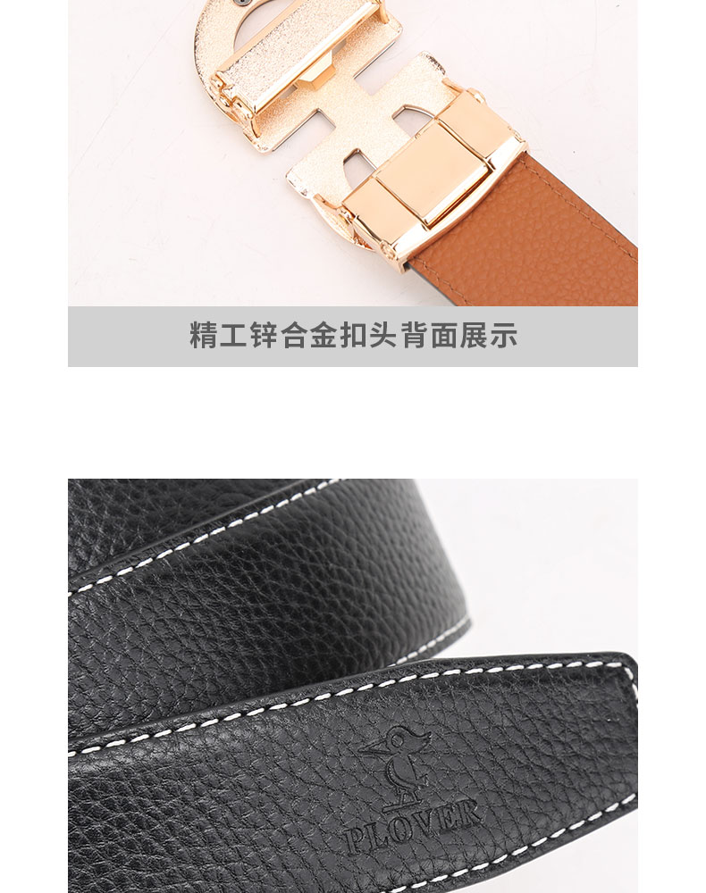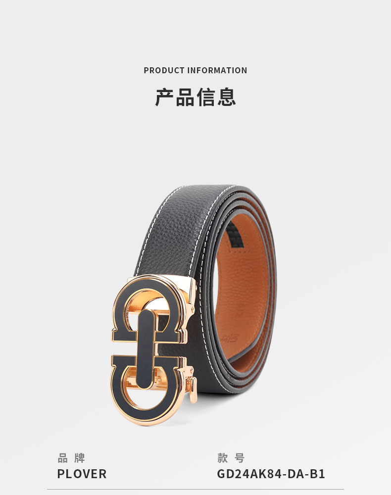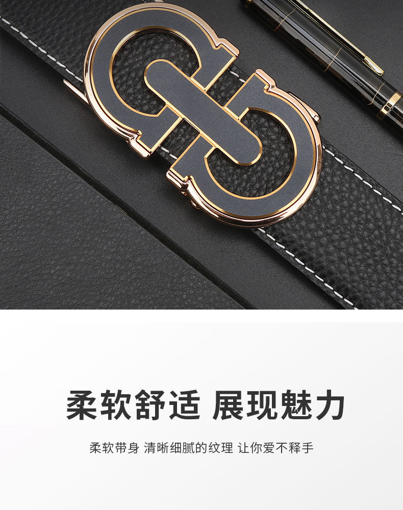 扣头采用锌合金真空电镀工艺,双D设计,新颖,带身精选最优质的头层牛皮,纹理精致细腻!外观细密柔软。走线工整,无缝连接,构想更增添立体感。