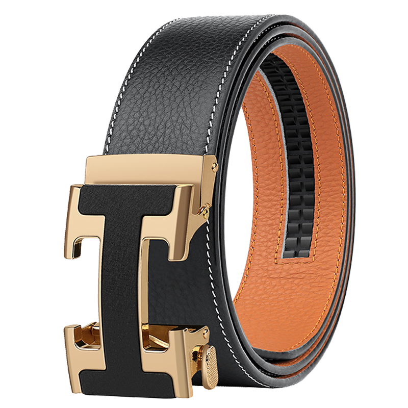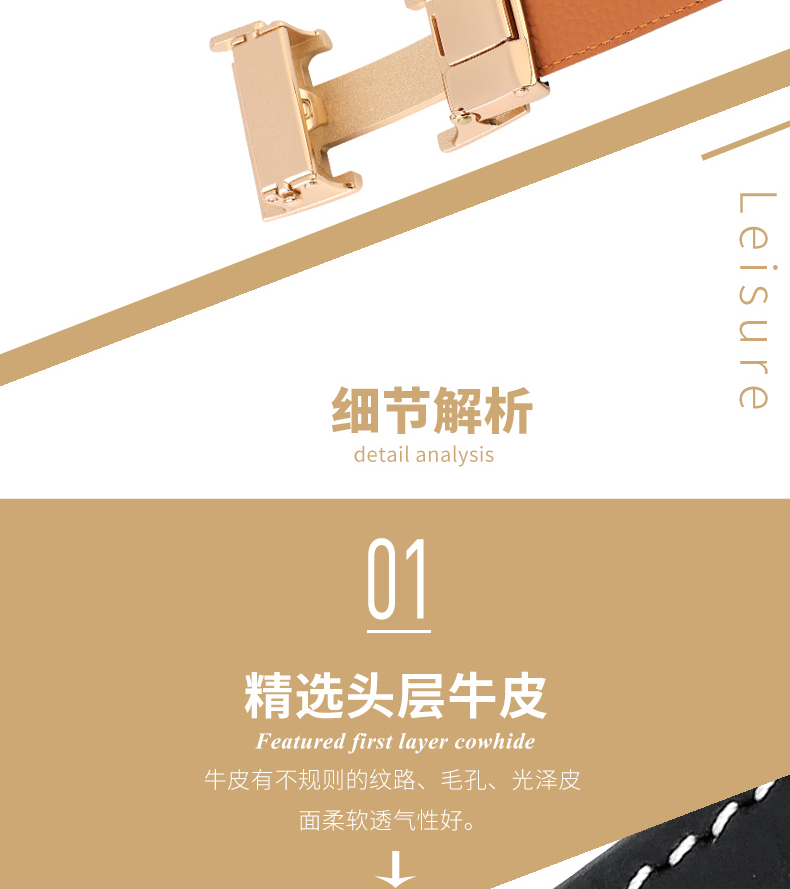 锌合金五金扣头,真空电镀工艺靓丽如镜面,激光雕刻纹理+贴标品牌LOGO,带身采用头层牛皮,耐变形夹层保证皮带在使用中不易变形,封边采用车线+油边工艺,带身尾部采用热压印LOGO工艺