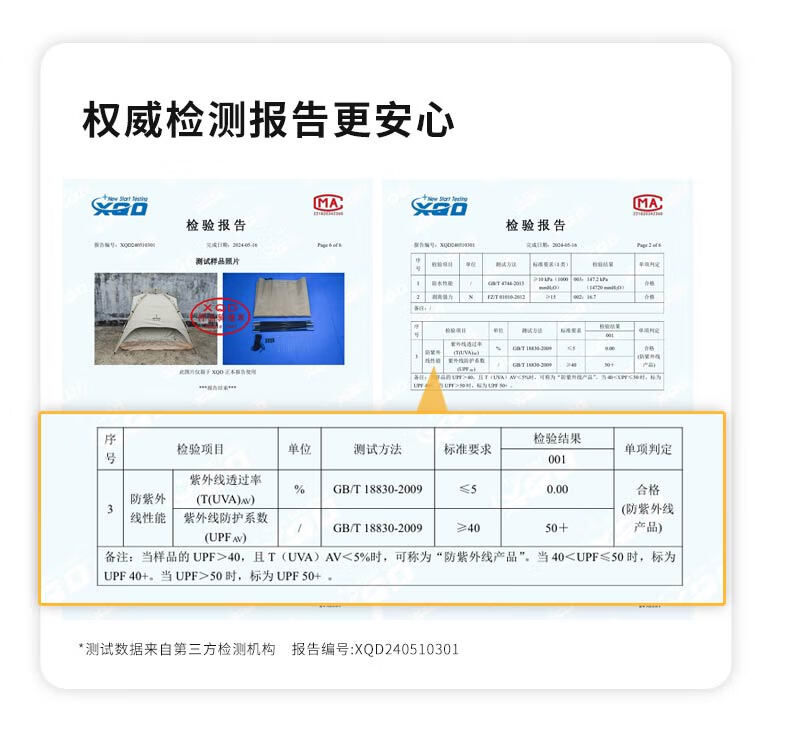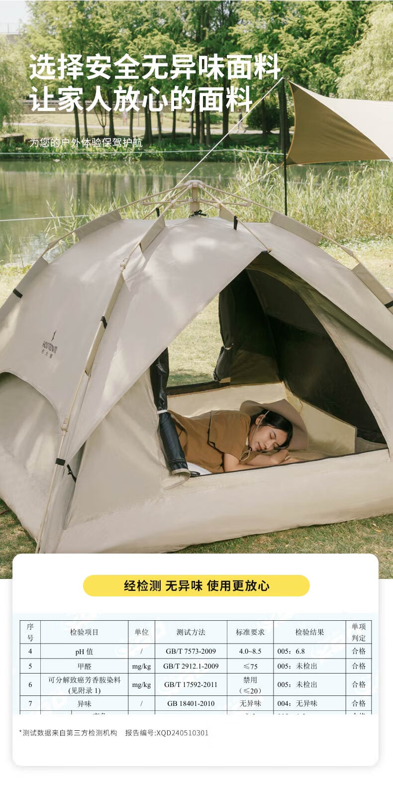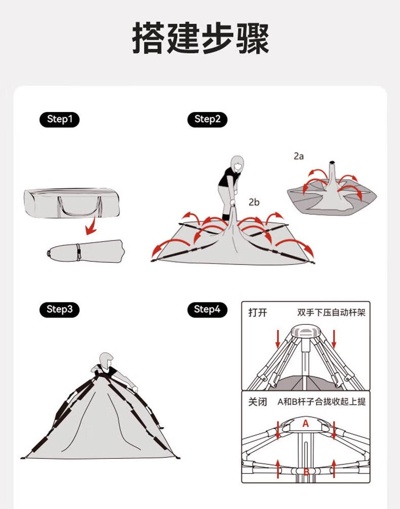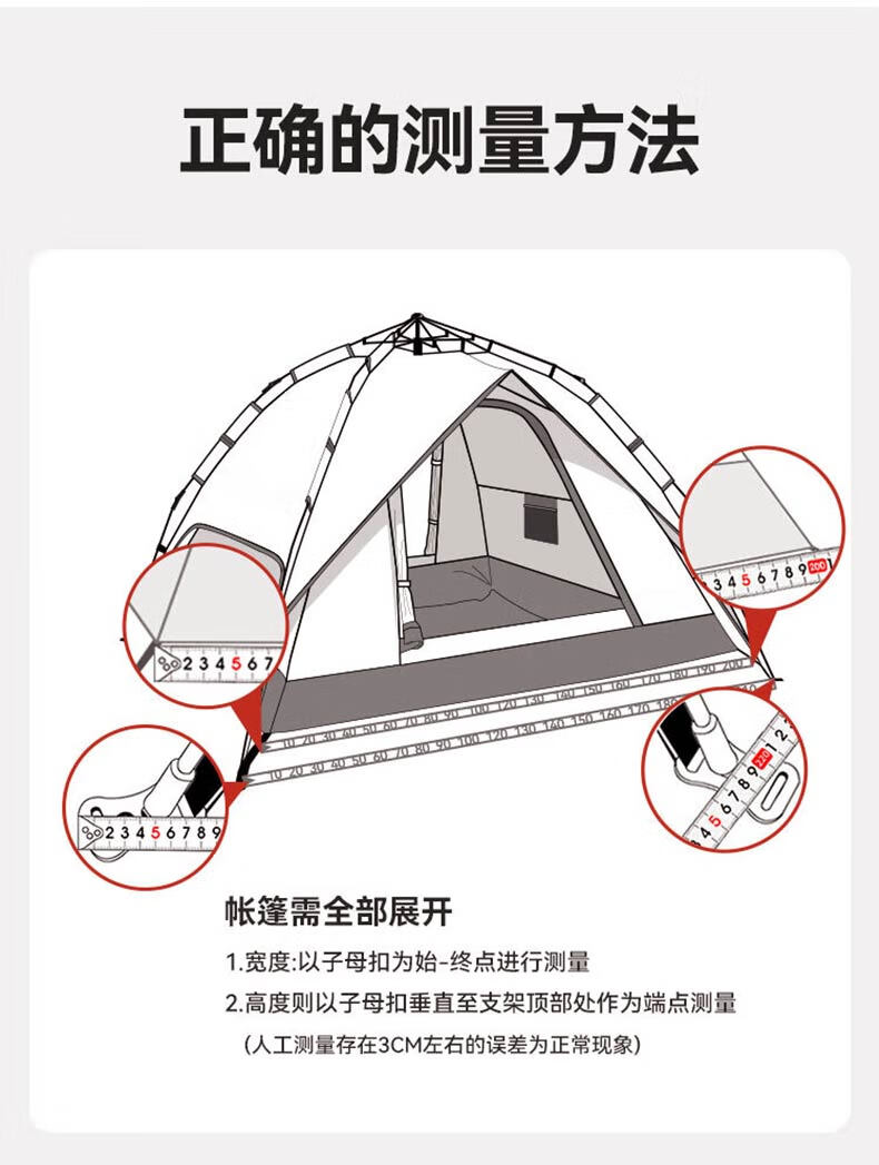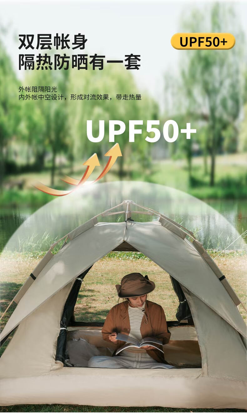 外帐面料采用210D黑胶pu布,有出色的防晒能力,防泼水、遮光、遮温、可自动速开搭建,方便使用。