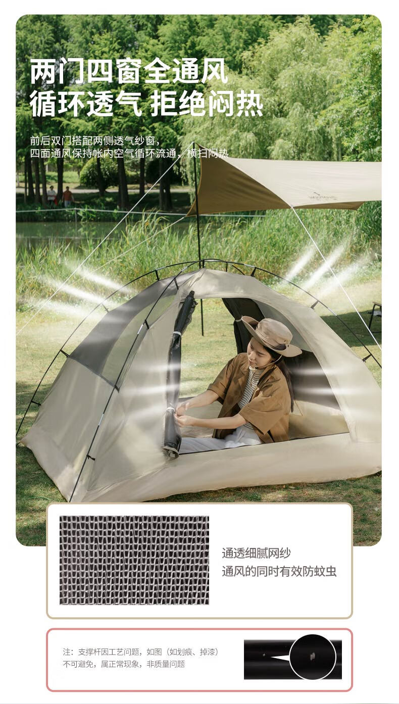帐篷前后采用大双开门,模仿自然通风原理,赶走闷热,双开门视野开阔,欣赏户外美景更佳,帐篷整体简约大气,宽敞透气。