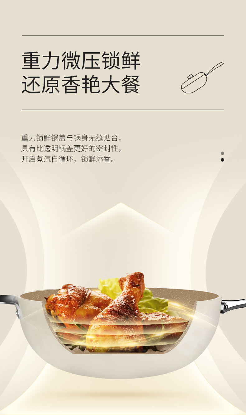 密封锅盖,精工所热,少油少烟,加深锅底不外溢。