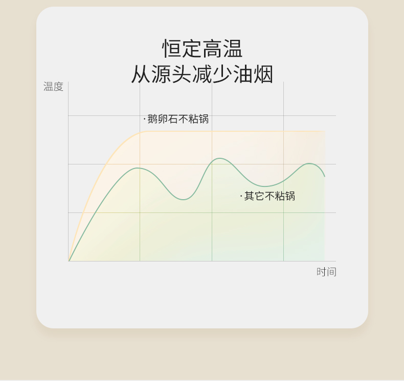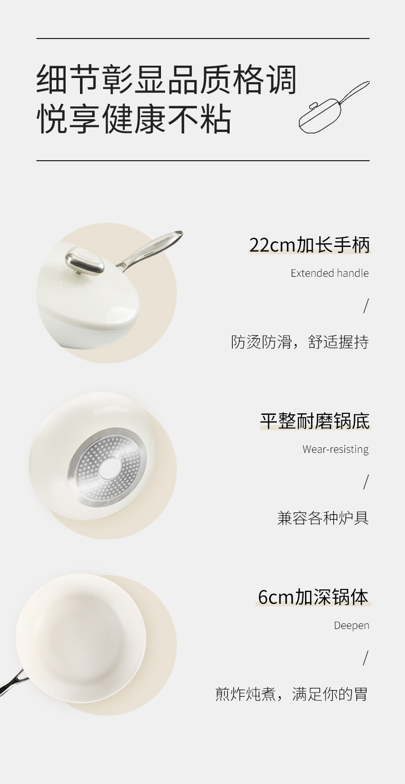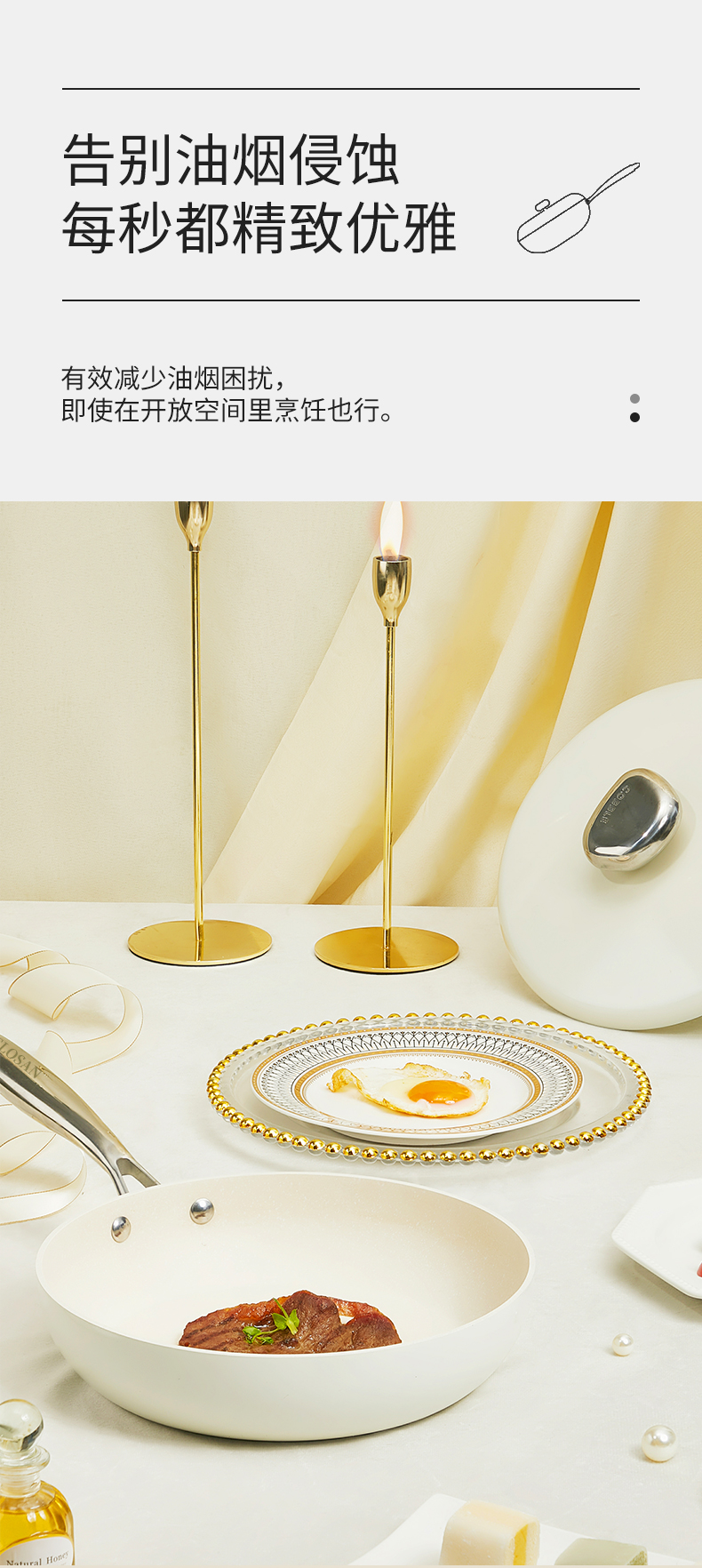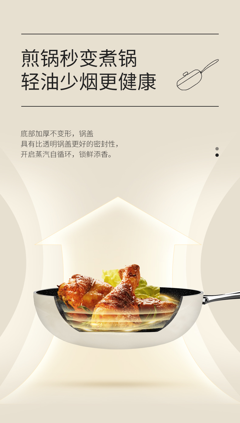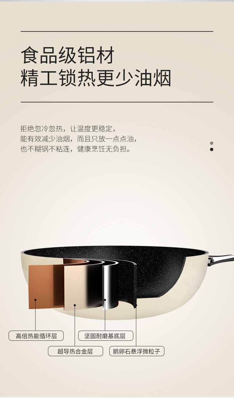 密封锅盖,精工所热,少油少烟,加深锅底不外溢。