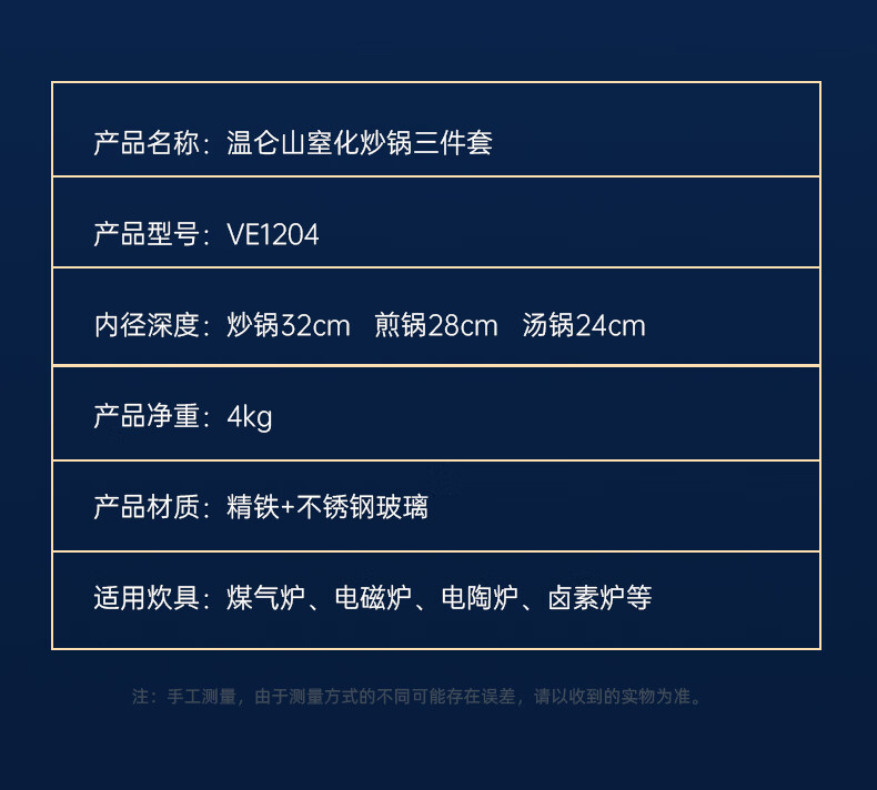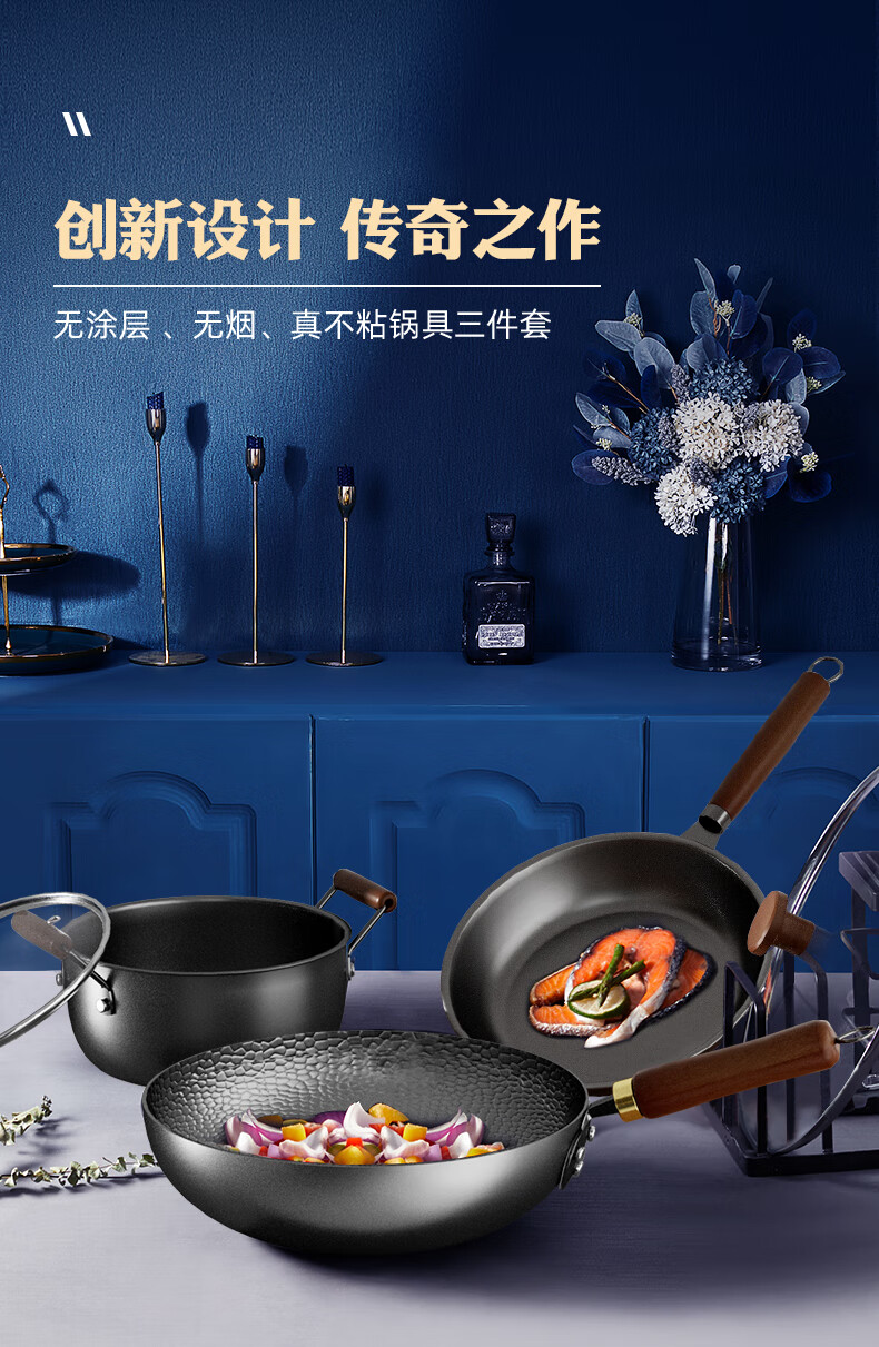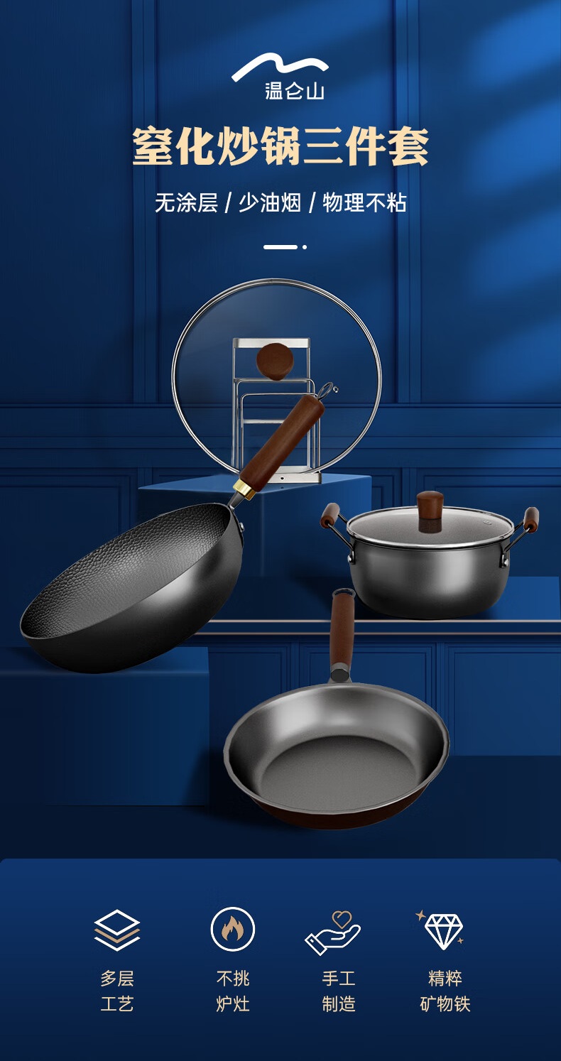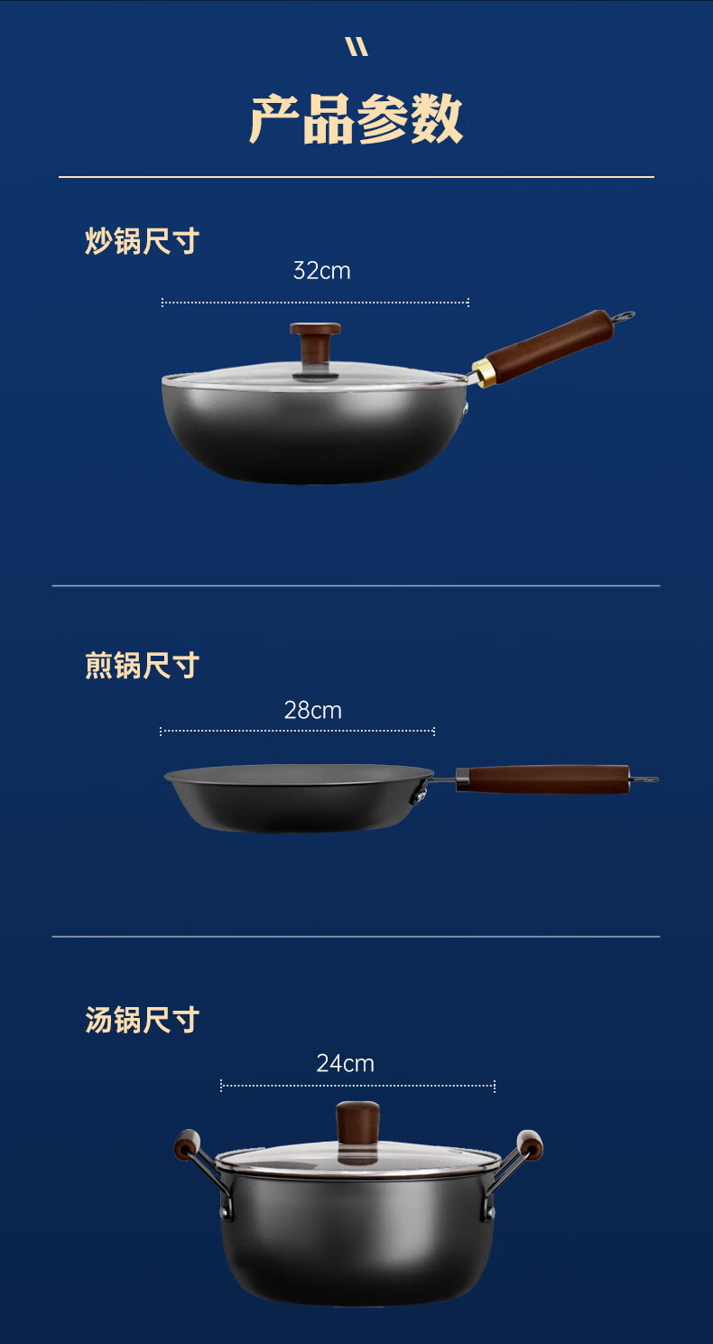 【材质】精铁+不锈钢玻璃+榉木 【规格】炒锅32cm、煎锅28cm、汤锅24cm